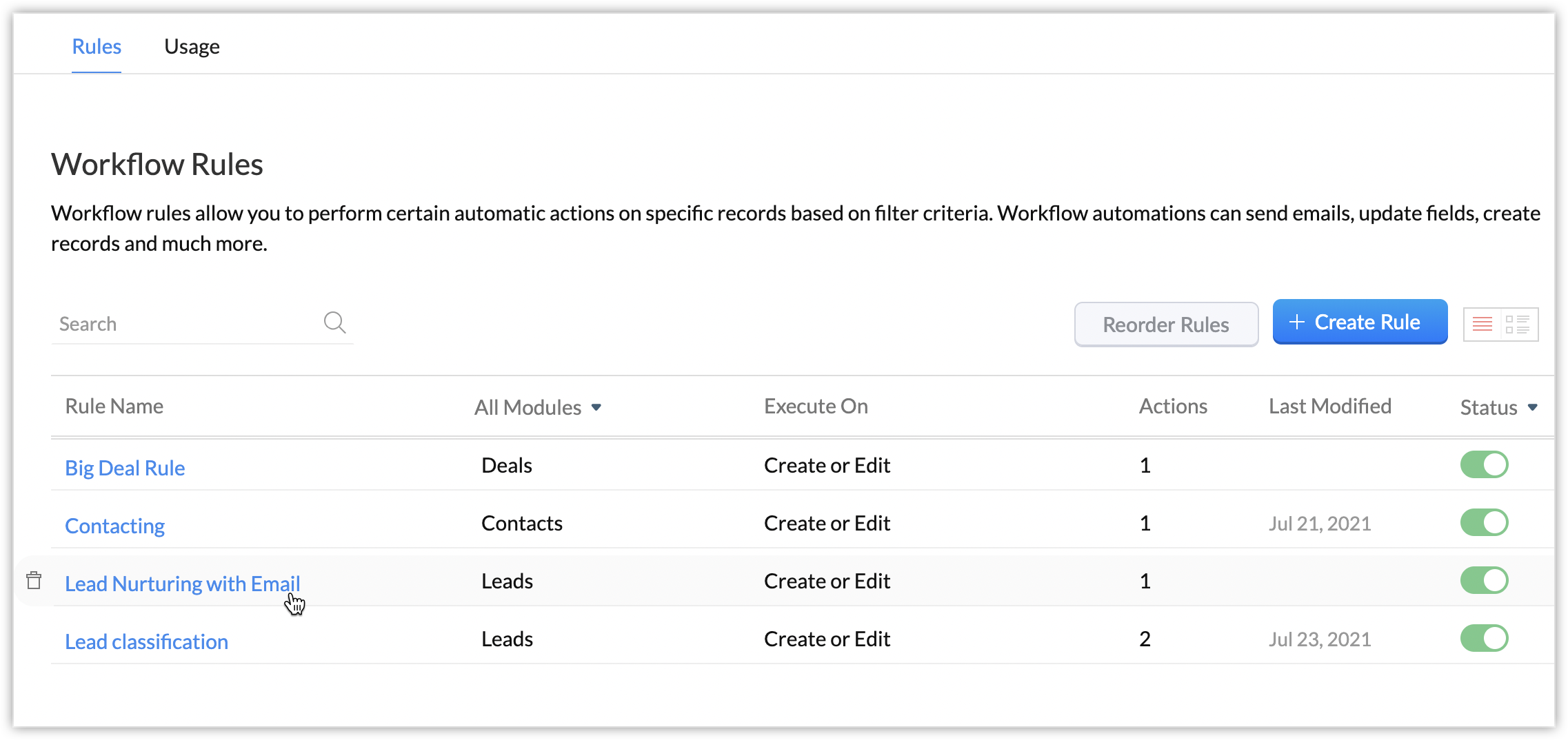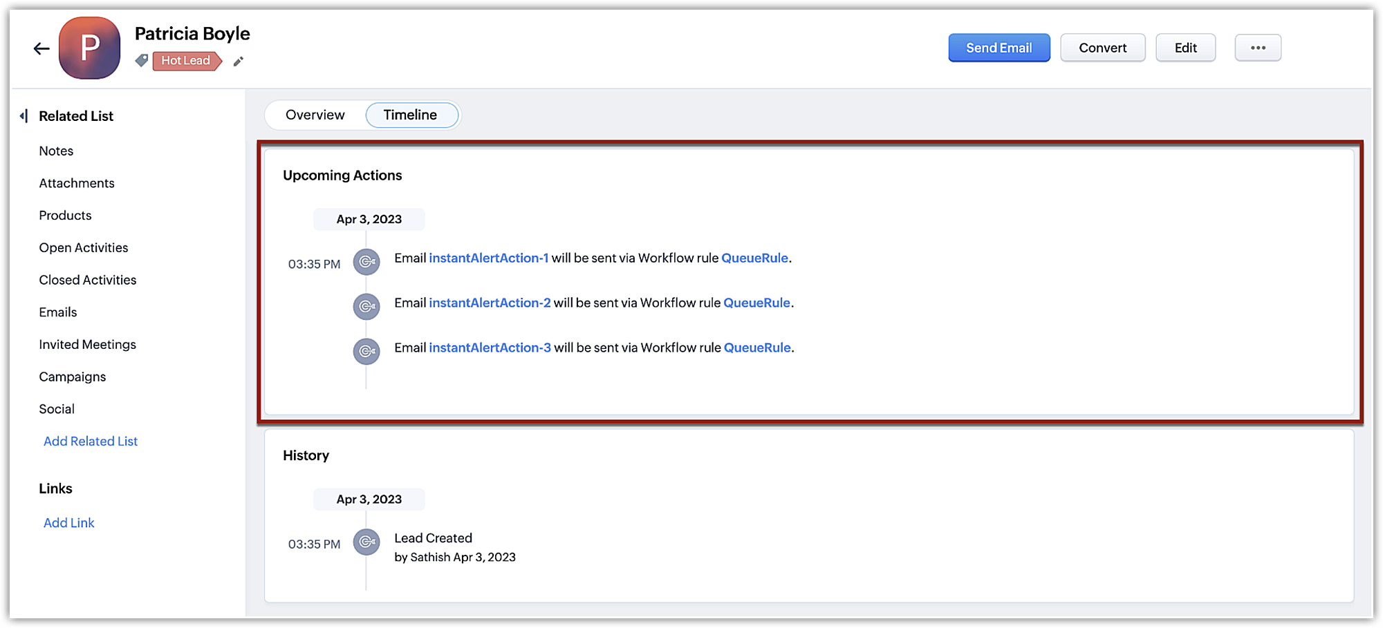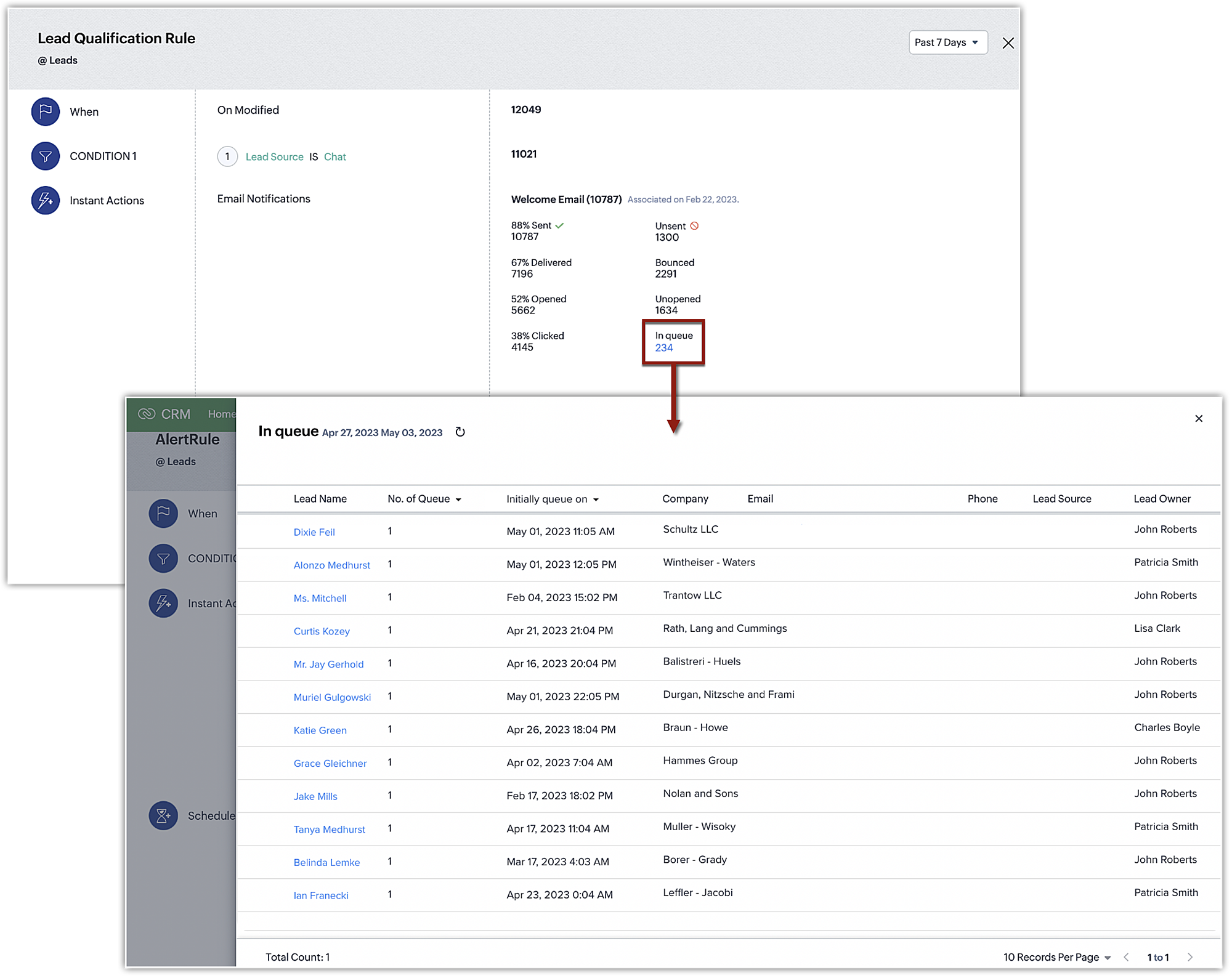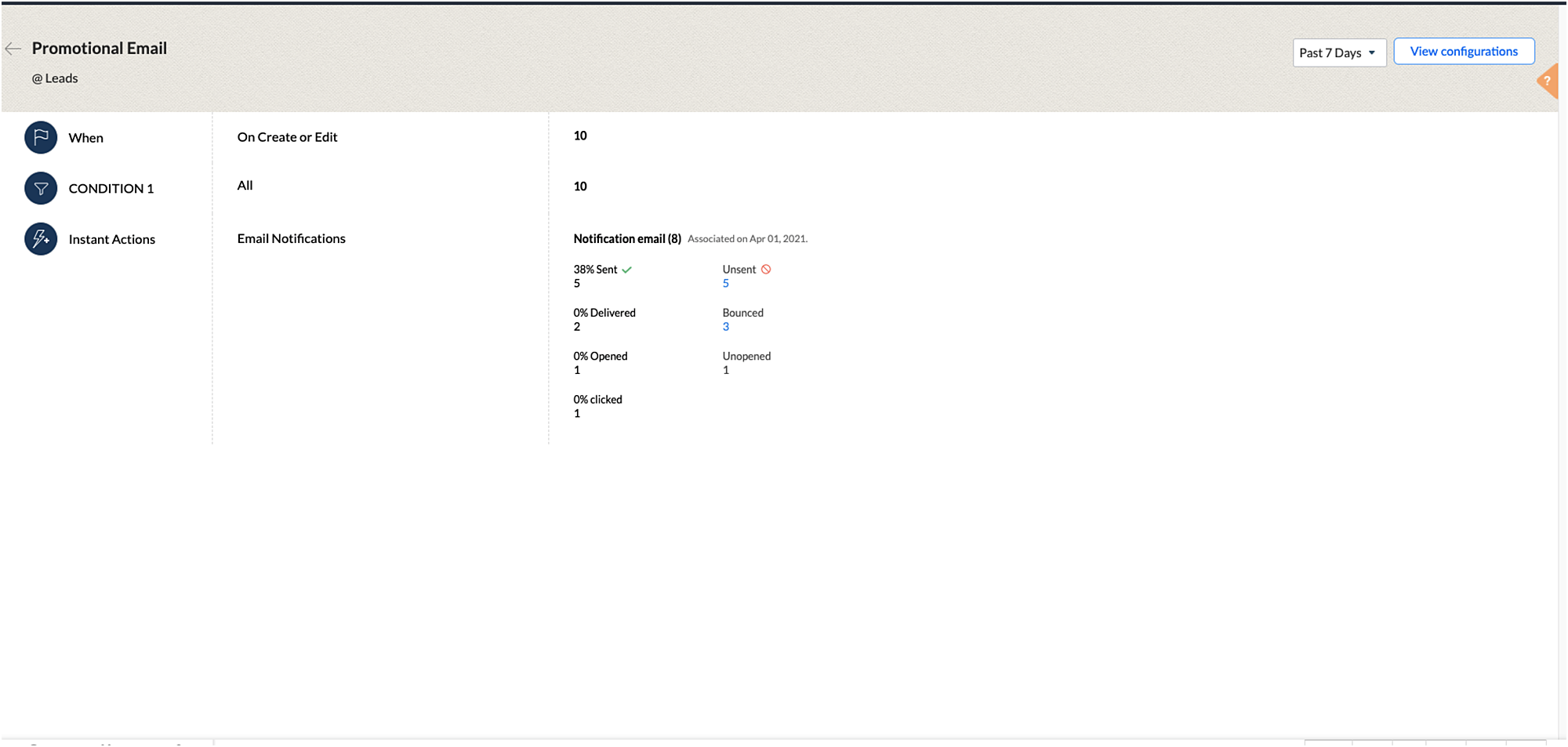 Să presupunem că ai configurat o regulă pentru a "trimite e-mail" tuturor prospecților care au participat recent la o conferință. Regula este declanșată și e-mailurile sunt trimise, dar nu ai nicio idee despre numărul de e-mailuri care au fost trimise, dacă vreun e-mail a fost respins sau câte dintre ele sunt în coadă etc. Cu rapoartele workflow poți vedea numărul exact de e-mailuri care au fost trimise, netrimise, respinse, nedeschise, accesate etc. Pentru e-mailurile care au fost respinse, poți de asemenea să dai clic pe ele pentru a afla cărei înregistrări aparțin și să reîncerci trimiterea la o adresă de e-mail alternativă sau să rectifici adresa existentă înainte de trimitere.