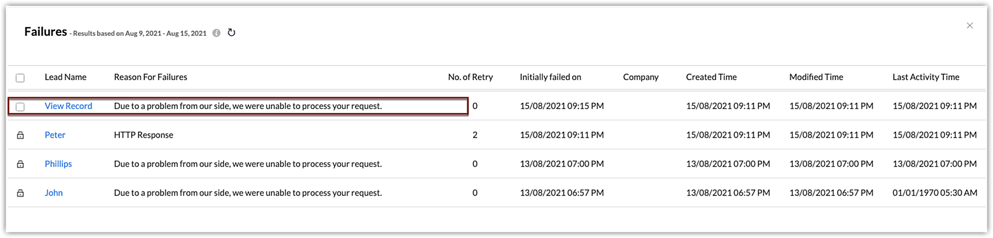 - Pentru utilizatorii care nu au permisiunea de a accesa un anumit modul, raportul de eșec nu va afișa detaliile înregistrării pentru acel utilizator, ci va fi afișat ca o opțiune Vizualizare înregistrare în detaliile înregistrării.
