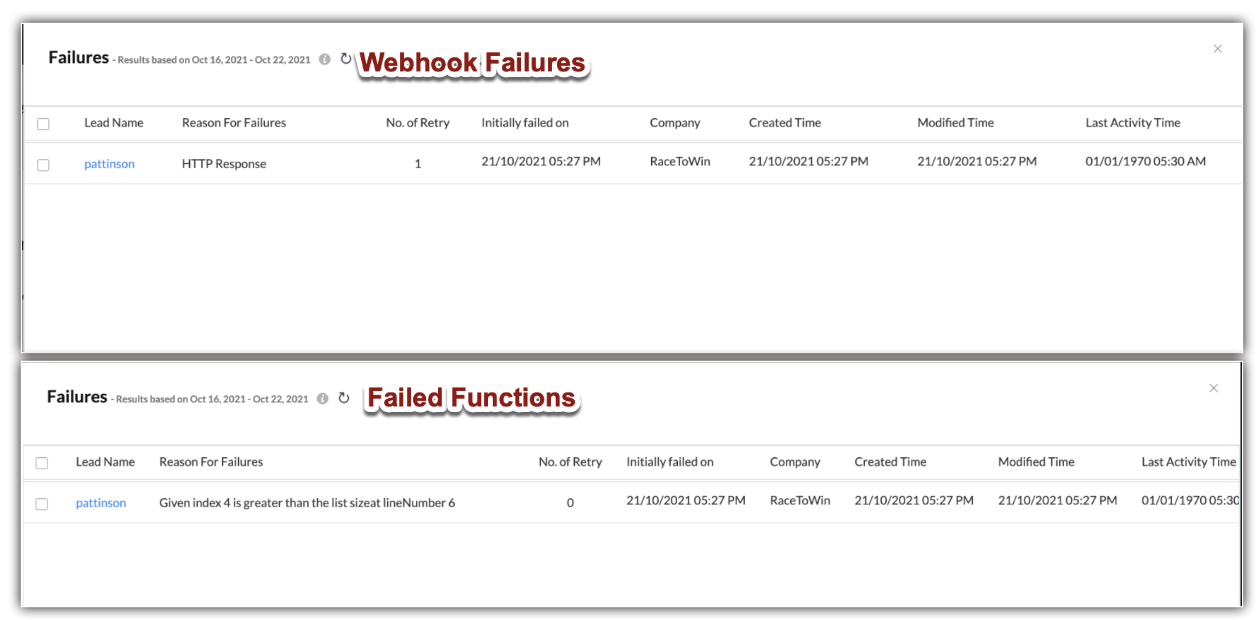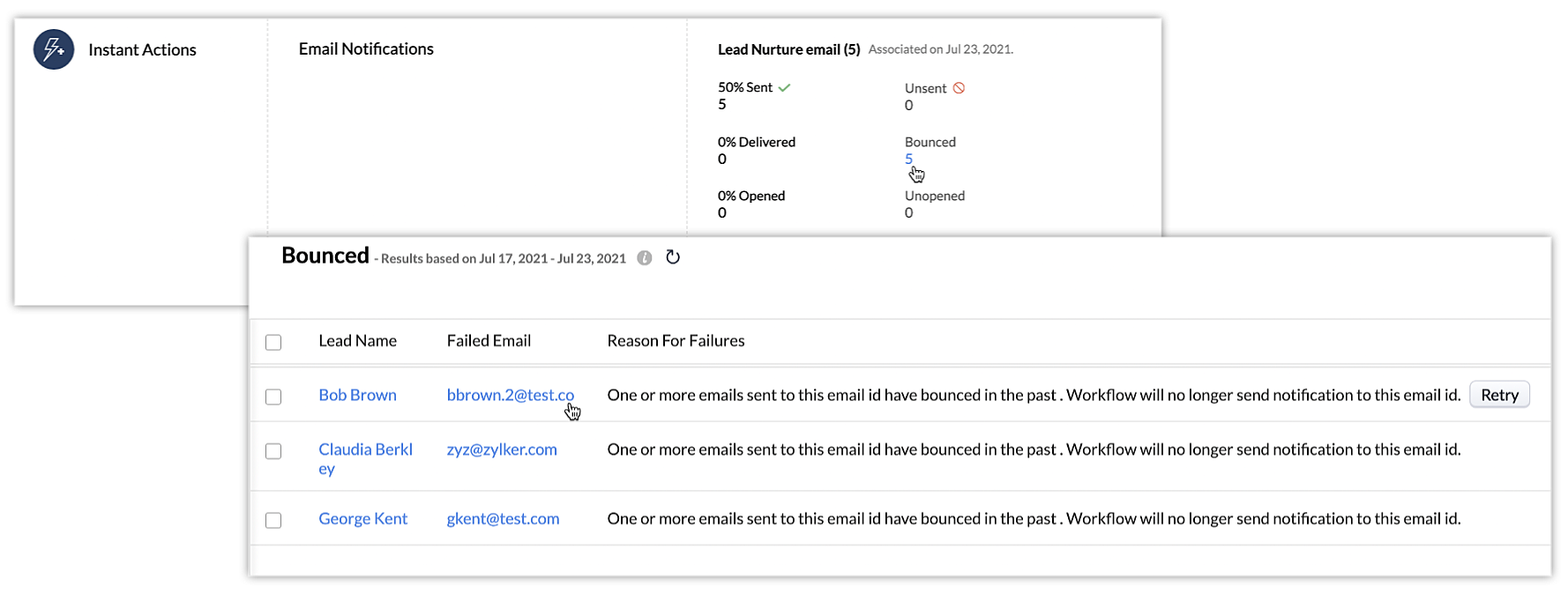 Rapoartele workflow clasifică ratele de succes și eșec ale acțiunilor care sunt efectuate. În timp ce rata de succes implică faptul că acțiunea este executată fără probleme, rata de eșec indică imposibilitatea de a executa acțiunea. O acțiune poate eșua din motive precum adresă de e-mail incorectă, depășirea limitei de e-mailuri pentru ziua respectivă sau orice defecțiune de funcționalitate în webhook sau funcții personalizate etc. Aceste informații despre eșecuri sunt afișate împreună cu motivul eșecului și detaliile înregistrării asociate. Cu lista de vizualizare a eșecurilor, poți vedea ce acțiuni au eșuat și motivul eșecului lor. Acest lucru ajută la remedierea erorii și apoi la reîncercarea acțiunilor pentru toate înregistrările sau pentru o înregistrare individuală.