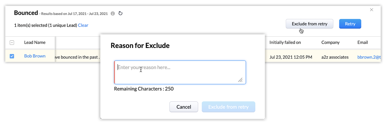 În scenariile în care nu vrei să reîncerci acțiunea(ile) sau să împiedici alți utilizatori cu permisiune workflow să reîncerce acțiunea, poți alege să excludi acțiunea de la reîncercare. Când alegi să excludi, vei fi solicitat printr-un câmp obligatoriu să furnizezi motivul excluderii, ajutând astfel alți utilizatori să înțeleagă motivul excluderii unei acțiuni de la reîncercare. De exemplu, poți exclude acțiunile eșuate ale unei campanii vechi de la reîncercare. Dacă vrei ca înregistrările excluse să fie incluse din nou, poți alege să incluzi acțiunile din nou pentru reîncercare. De exemplu, dacă ai exclus o acțiune eșuată din greșeală, o poți include din nou pentru reîncercare.