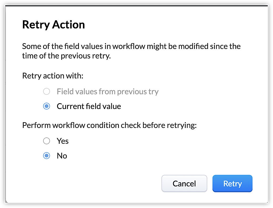 Înainte de a continua cu acțiunea de reîncercare, vei fi solicitat să alegi 2 factori determinanți - Reîncearcă acțiunea cu și Efectuează verificarea condiției workflow înainte de reîncercare.