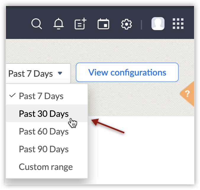 - Poți vizualiza raportul anterior al unei reguli dând clic pe lista derulantă din pagina rapoartelor workflow. Poți folosi și filtrul pentru a vizualiza regulile din zilele anterioare (ultimele 7 zile, ultimele 30 de zile) sau pentru a defini un interval de date personalizat de până la 7 zile.