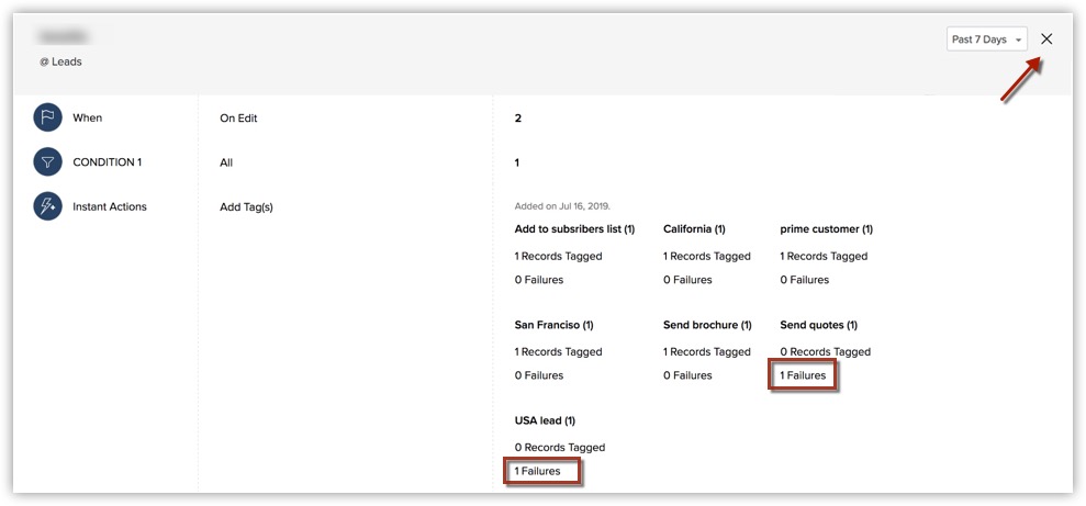 - Etichetarea înregistrărilor va fi efectuată conform limitării funcționalității din CRM (10 etichete/înregistrare). Prin urmare, odată ce înregistrarea atinge limita maximă pentru etichetare, etichetele rămase vor fi afișate sub numărul de eșecuri. De exemplu, dacă o înregistrare are deja 5 etichete și prin regula workflow ar trebui să adauge încă 7 etichete, atunci pe baza limitării doar 5 etichete suplimentare vor fi adăugate, iar cele 2 rămase vor fi listate sub numărul de eșecuri.