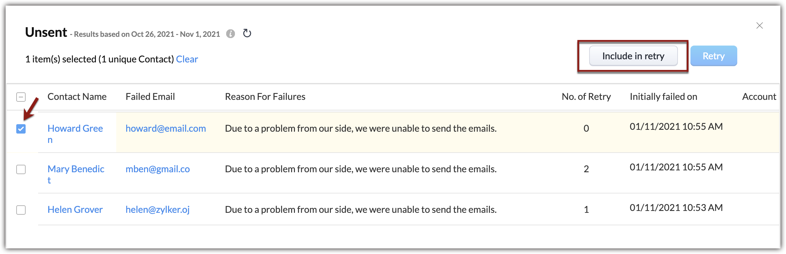 - Opțiunea de reîncercare va fi disponibilă doar pentru e-mailurile eșuate trimise către domenii externe (adică un lead sau un client). Nu va fi afișată pentru e-mailurile eșuate trimise către utilizatorii CRM, roluri și grupuri.