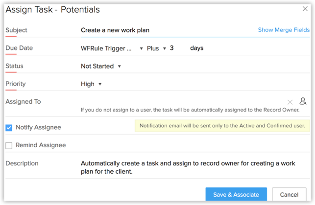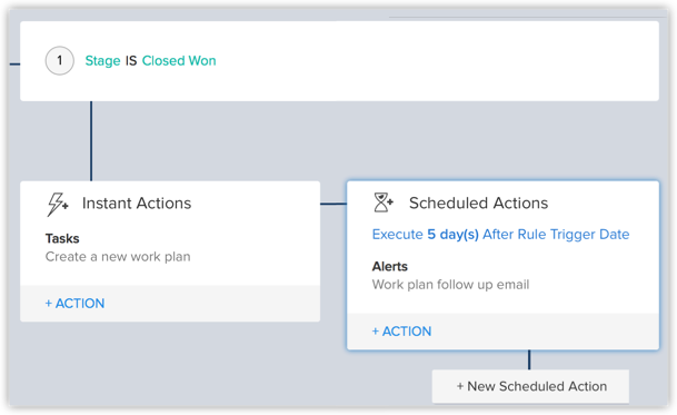 Astfel, o sarcină va fi atribuită automat proprietarului potențialului ori de câte ori un potențial este Closed Won, iar un email de urmărire va fi trimis la 5 zile după ce sarcina i-a fost atribuită automat.