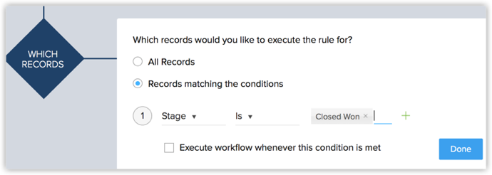 - Setează criteriile regulii: Criteriul trebuie să fie „Potential Stage is Closed Won". Asigură-te că NU selectezi Execute workflow whenever this condition is met. Dacă această casetă de bifare nu este selectată, înseamnă că workflow-ul va fi executat doar când condiția este îndeplinită pentru prima dată, ceea ce funcționează în acest caz.