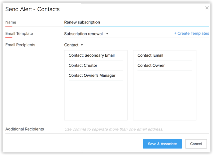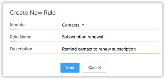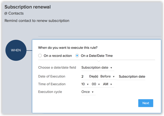Să presupunem că vrei ca un reminder automat prin email să fie trimis clienților tăi, solicitându-le să își reînnoiască abonamentul cu două zile înainte de data scadenței. Iată cum poți face asta cu ușurință în Zoho CRM.