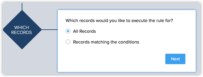 - Setează criteriile regulii: Dacă crezi că regula ar trebui să se aplice doar unui set specific de înregistrări, menționează criteriile regulii în mod corespunzător. Altfel, selectează All records. În acest caz, regula va fi aplicabilă pentru toate înregistrările din modulul Contacts.