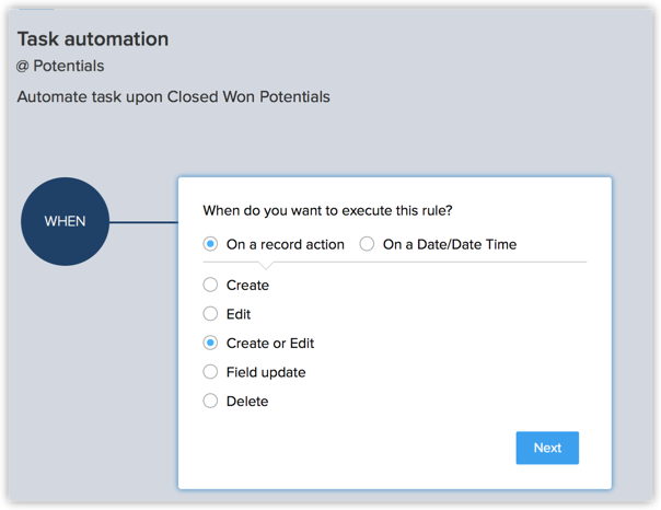 - Specifică declanșatorul regulii: Selectează On a record action. Este ideal să specifici Create sau Edit ca declanșator al regulii, deoarece vrei ca regula să fie executată ori de câte ori un potențial nou este creat cu Closed Won ca Potential Stage sau etapa unui potențial existent este actualizată la Closed Won.