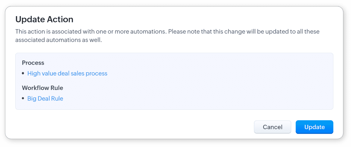 Acțiunile sunt definite pentru module specifice. Regulile de Workflow, Procesele de aprobare și Blueprint-urile create pentru un modul pot avea acțiuni care sunt create pentru același modul. Aceste acțiuni sunt declanșate atunci când criteriile sunt îndeplinite în funcționalitățile asociate. De exemplu, poți direcționa o înregistrare pentru aprobare fie când înregistrarea este editată, fie când este creată, și poți asocia o alertă prin email managerului care trebuie să aprobe. Similar, în Blueprint diferite acțiuni (alerte email, atribuire sarcini sau actualizare câmpuri) pot fi setate să se declanșeze când o tranzacție trece dintr-o etapă în alta. În cadrul regulilor de workflow, Zoho CRM îți permite să asociezi acțiuni care pot fi declanșate imediat când condițiile sunt îndeplinite sau să le programezi pentru a fi declanșate la un moment specific.
