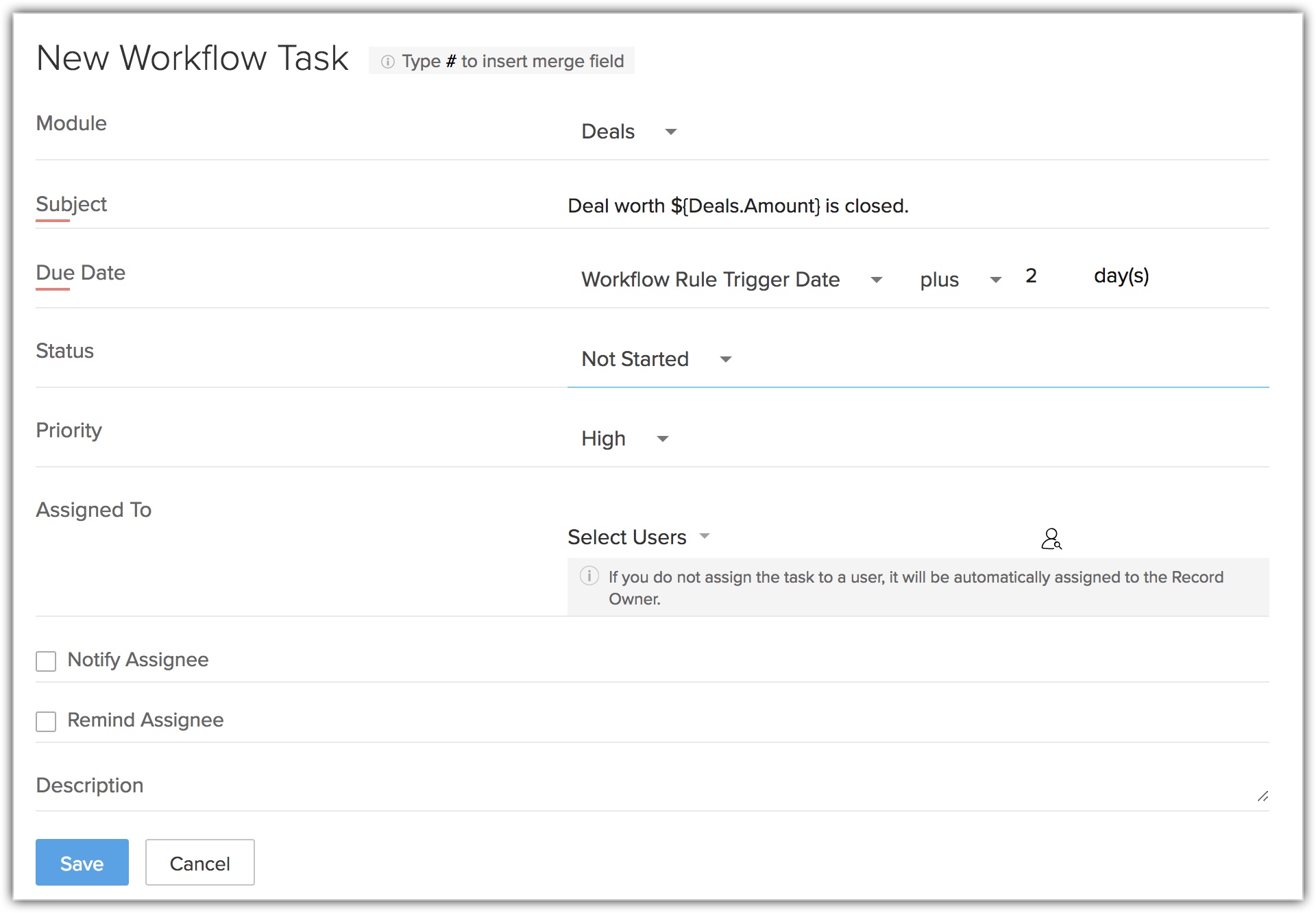 - Dacă câmpul Assigned To nu este specificat, sistemul va atribui automat sarcina proprietarului înregistrării.