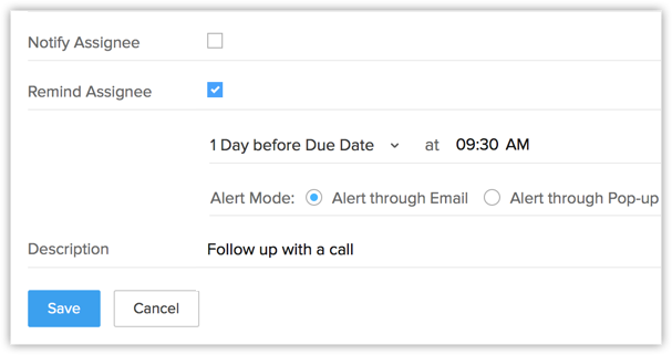 - Alert through Pop-up - Un memento pop-up va fi inițiat pentru proprietarul sarcinii la ora specificată.