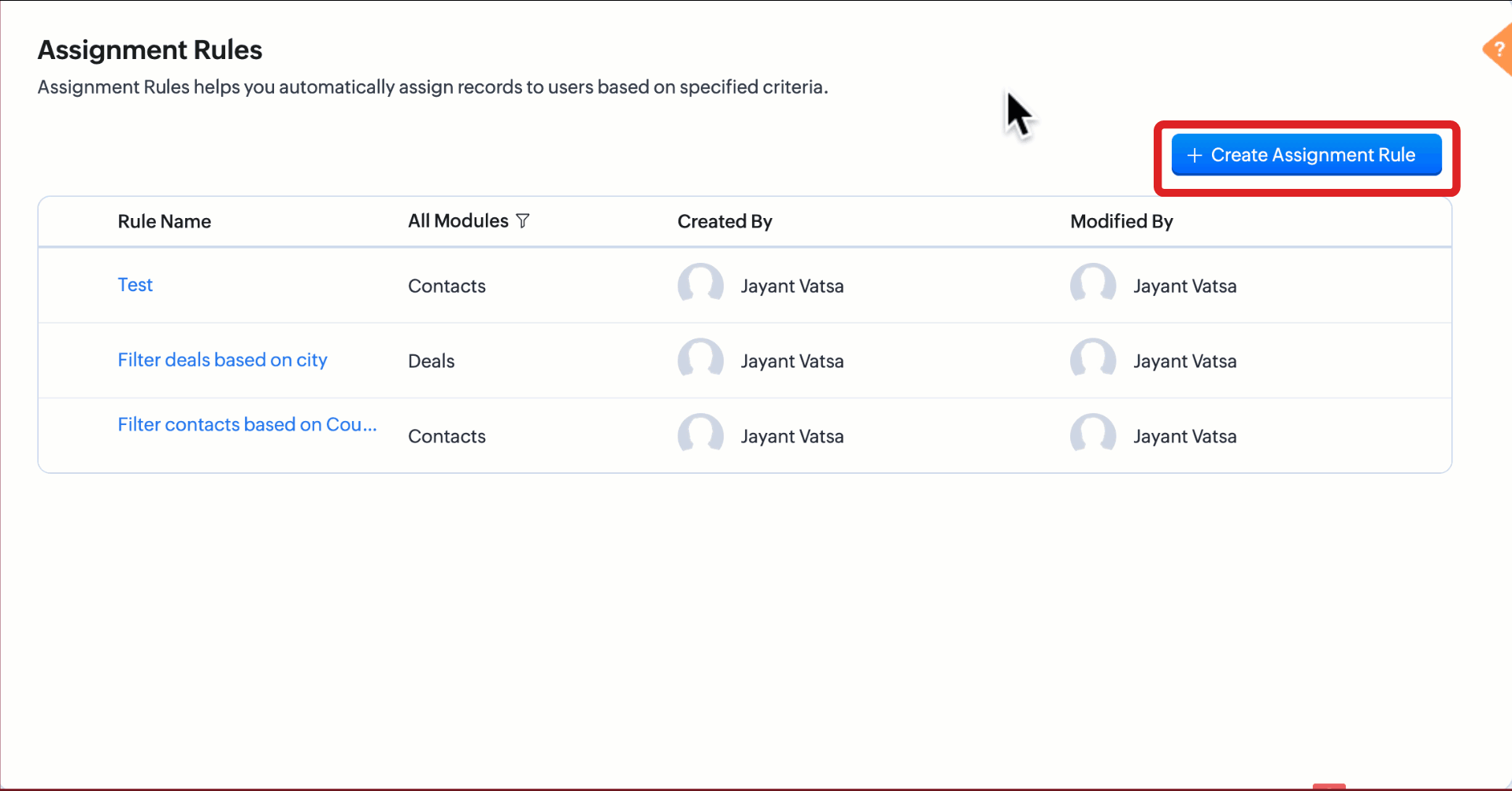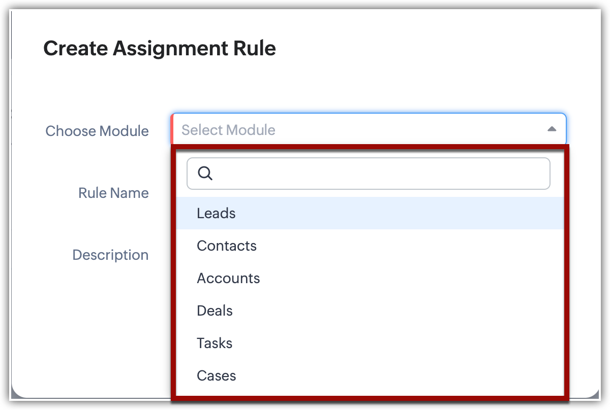 Zoho CRM permite administratorilor și utilizatorilor cu permisiunea de configurare Assignment Rules să configureze reguli de atribuire atât pentru modulele standard, cât și pentru cele personalizate. Modulele în care înregistrările intră frecvent în sistem în cantități mari, cum ar fi Leads, Contacts, Accounts, Deals, Tasks și modulele personalizate, pot beneficia de utilizarea regulilor de atribuire.