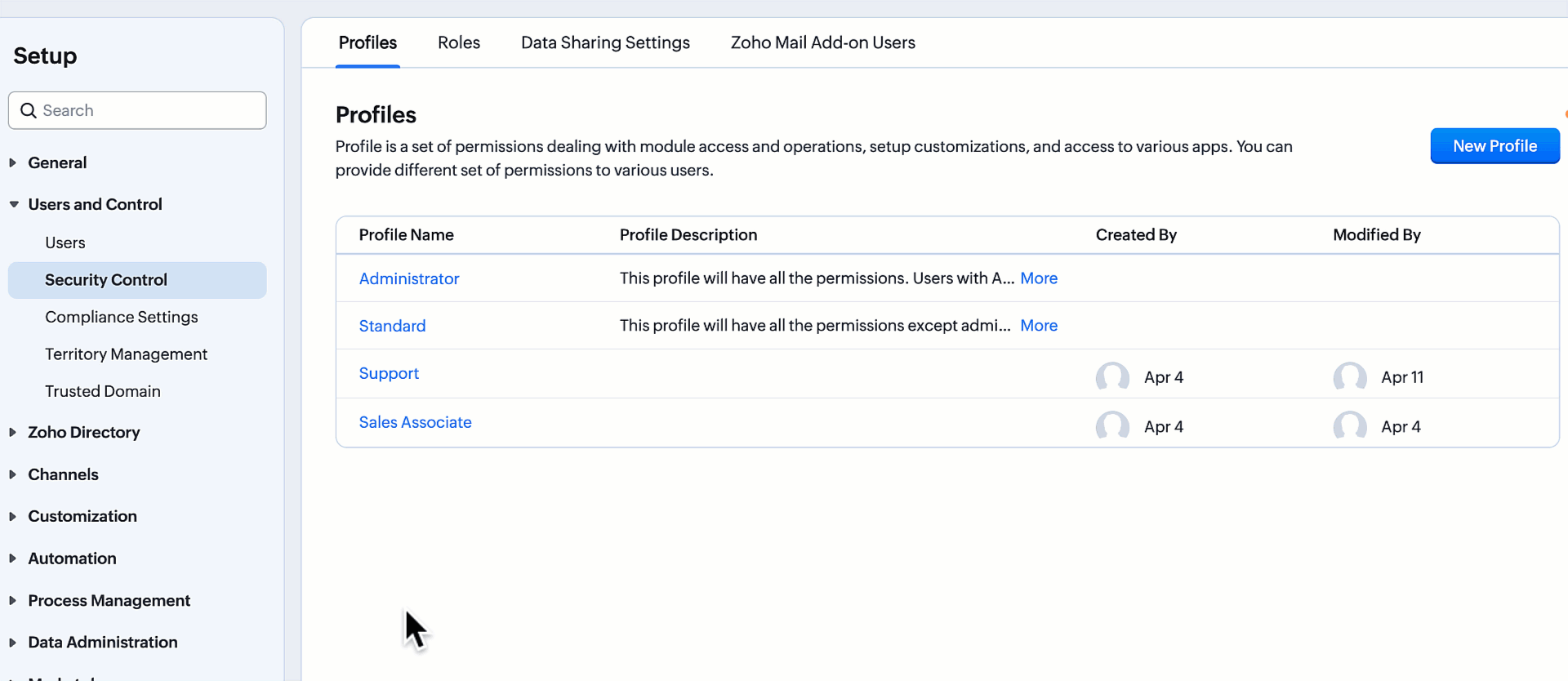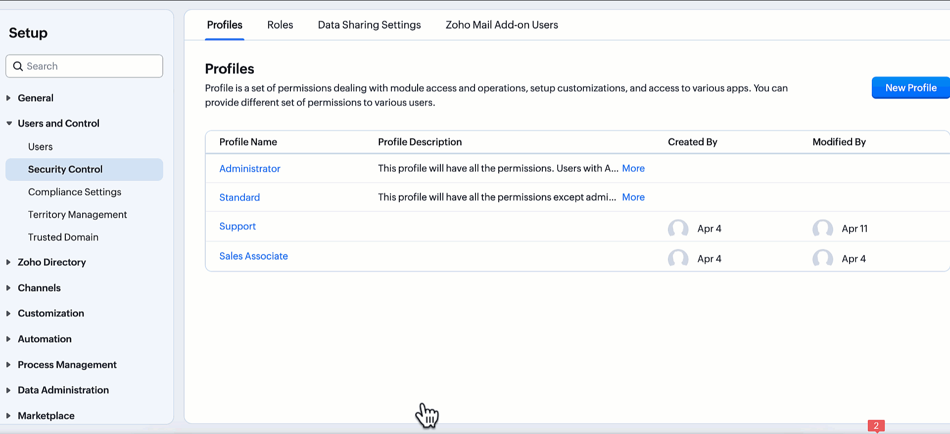 - Mergi la Setup > Security Control > Profiles.