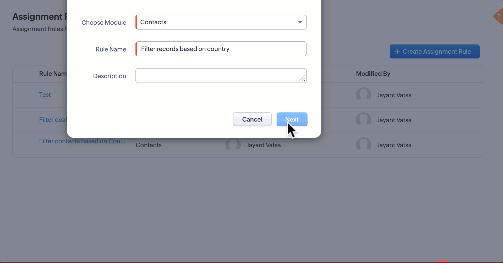 - În fereastra pop-up Create Assignment Rule, alege modulul și introdu numele regulii.