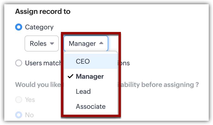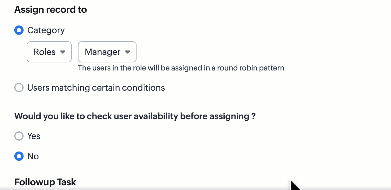 De exemplu, dacă alegi rolul Managers, atunci înregistrările vor fi atribuite tuturor utilizatorilor cu rolul Manager prin rotație.