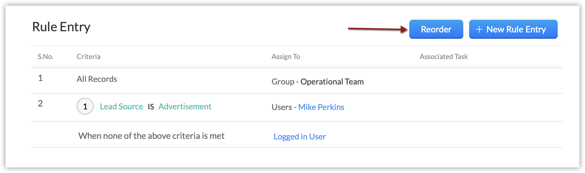 De exemplu, trei intrări de reguli sunt create cu criterii diferite și vrei ca aceste criterii să fie evaluate într-o ordine specifică. Dacă reordonezi intrările, regulile de atribuire vor verifica automat înregistrările conform regulilor în ordinea de preferință și vor atribui înregistrările pe baza primei reguli pentru care se califică.