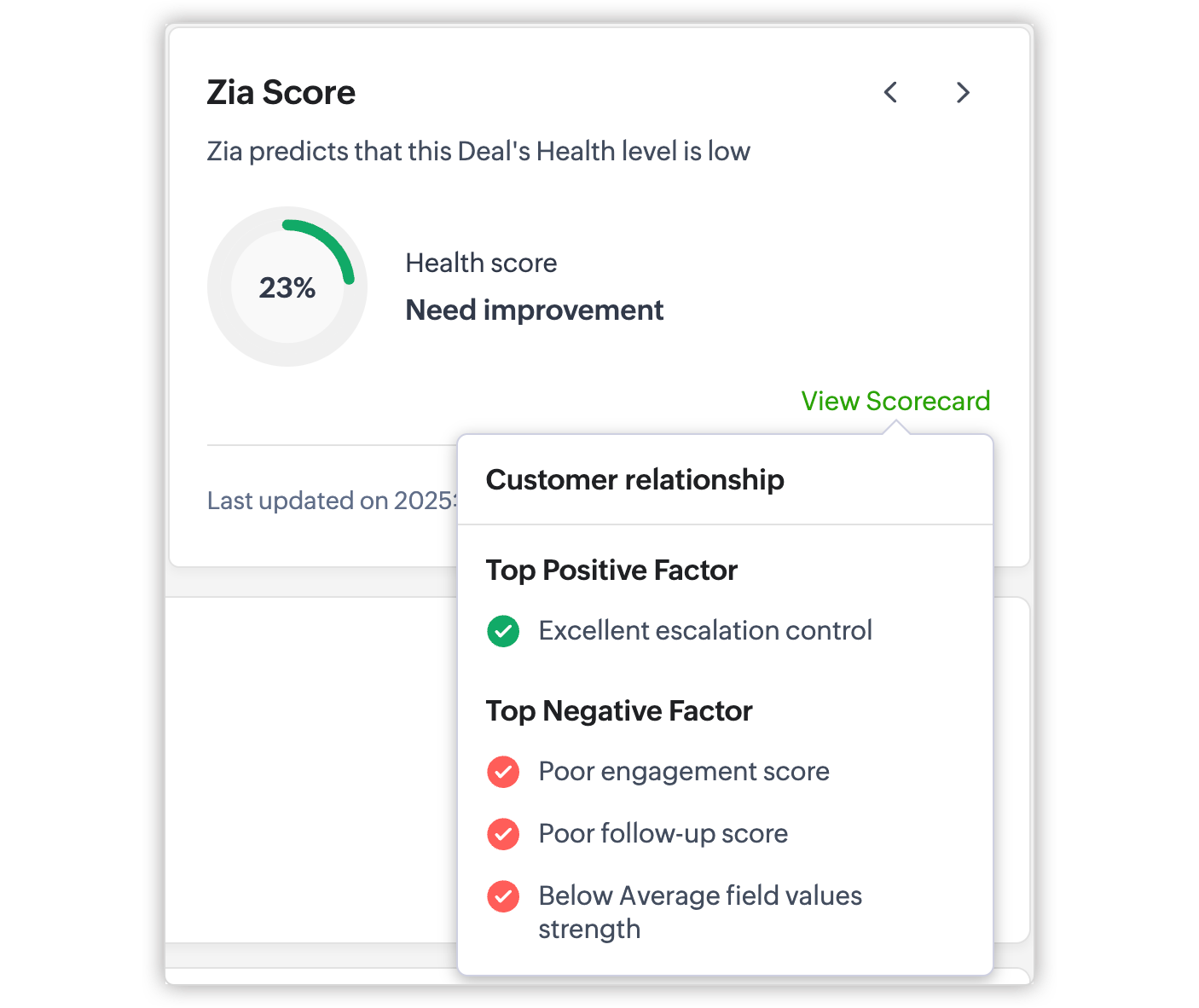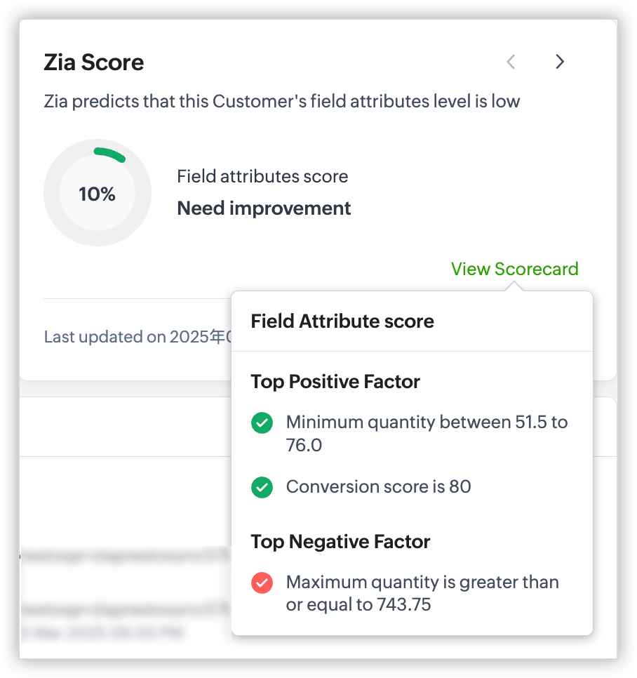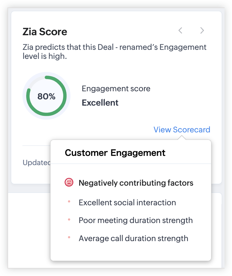 Zia poate lua în considerare datele modulului, datele modulelor asociate, datele activităților asociate și alte informații obținute din SalesSignals și alte funcționalități integrate cu CRM-ul tău. Zia poate analiza aceste informații pentru a ajunge la un scor care reprezintă sănătatea, implicarea, follow-up-ul, probabilitatea de conversie și atributul câmpului pentru o anumită înregistrare, facilitând prioritizarea eforturilor și alocarea mai eficientă a resurselor.