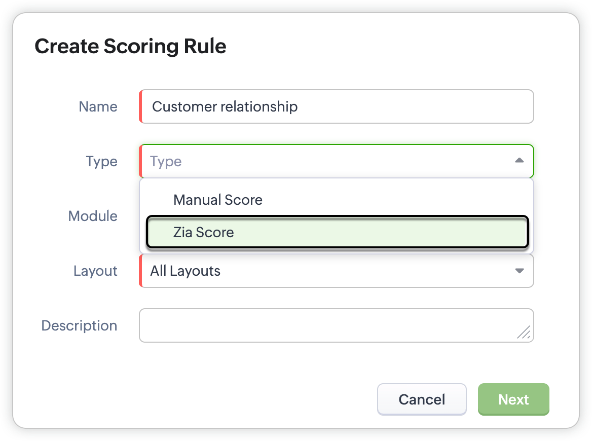 - Chiar dacă ai activat Scorurile Zia, poți configura în continuare reguli de punctare manuală pentru același modul în Zoho CRM ca de obicei.