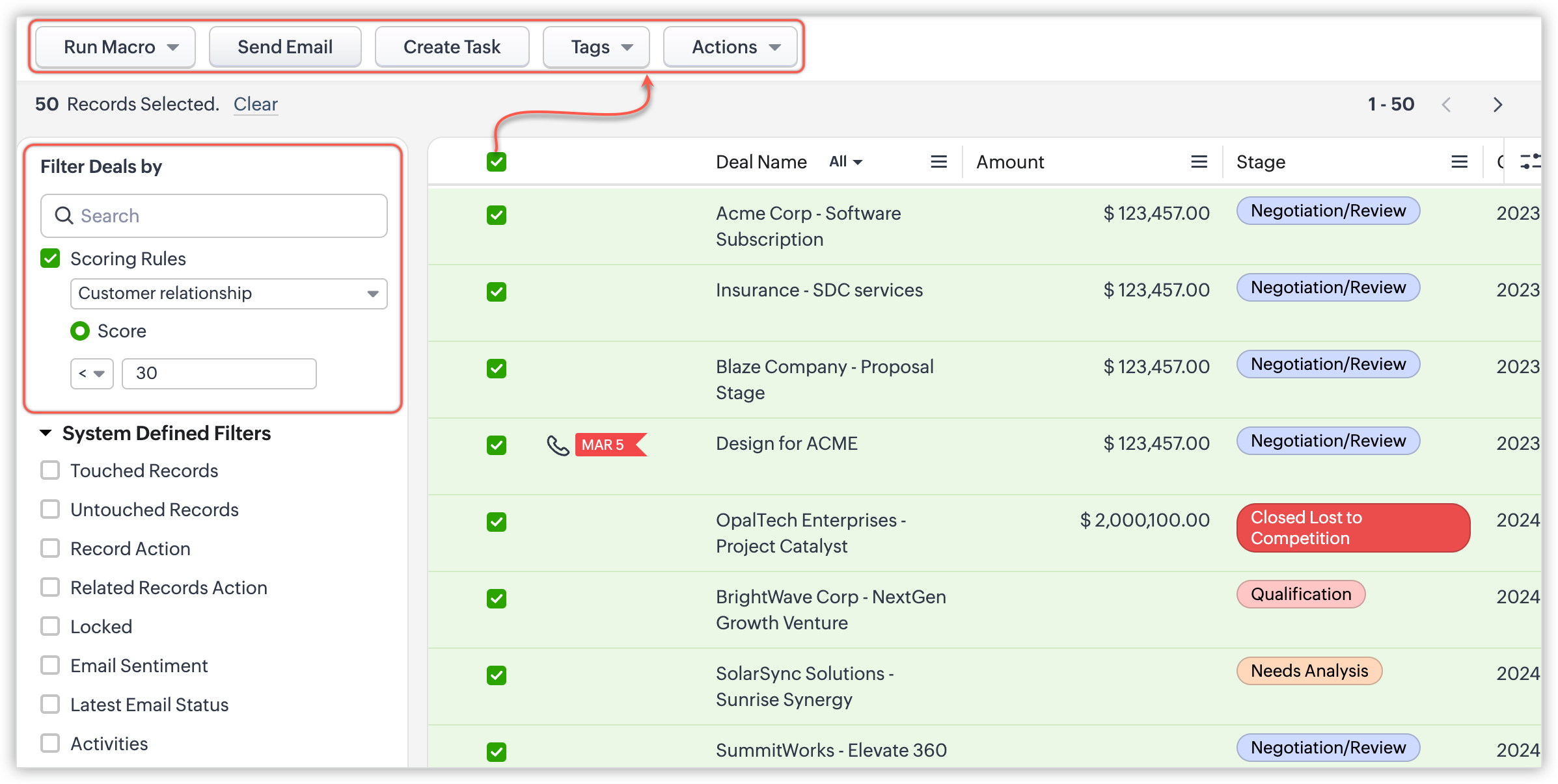 Utilizatorii pot filtra înregistrările pe baza regulilor de punctare și pot efectua acțiuni în masă, cum ar fi trimiterea de emailuri, atribuirea sau programarea sarcinilor, actualizarea mai multor înregistrări, adăugarea de etichete și altele.