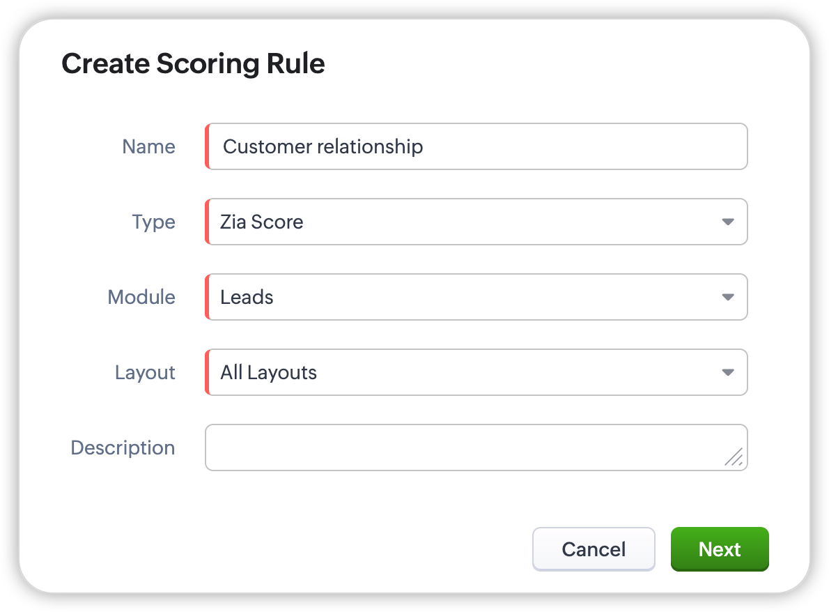 Ce-ar fi dacă în loc să configurezi aceste reguli manual, ai avea asistentul inteligent artificial al Zoho să puncteze automat înregistrările din orice modul din sistemul tău și să-ți ușureze munca? Scorurile Zia reprezintă o metodologie de punctare bazată pe AI care ia în considerare toate informațiile legate de o anumită înregistrare, apoi calculează un scor pentru aceasta. Această funcționalitate permite utilizatorilor să configureze Scorul Zia pentru a puncta automat înregistrările din orice modul pe baza cerințelor lor specifice de afaceri.
