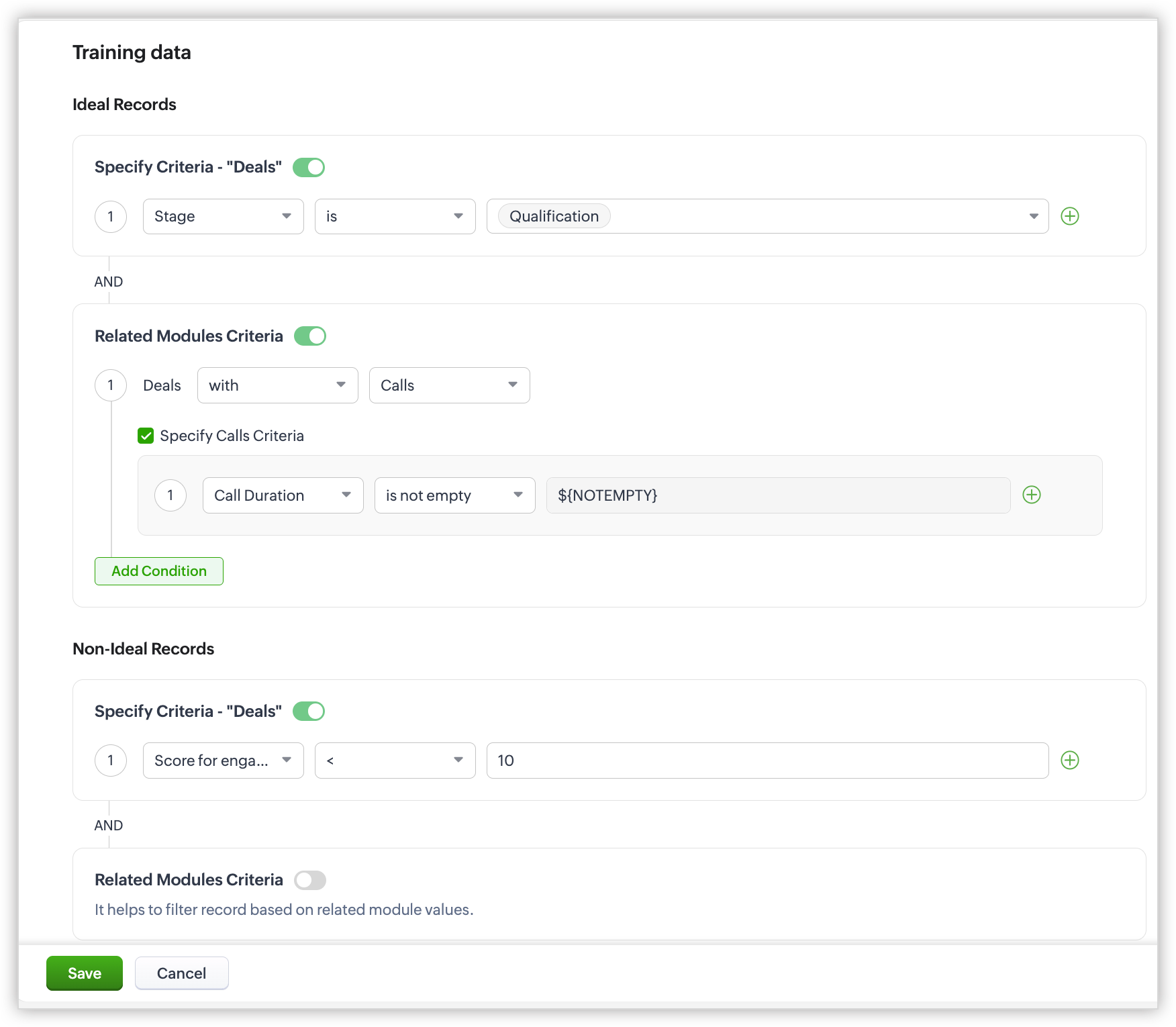 - Setează criterii pentru ca Zia să clasifice înregistrările ideale și neideale ale modulului în secțiunea Date de antrenare. Zia consideră informațiile înregistrărilor care se potrivesc cu acest set de criterii ca date de antrenare și învață din ele. Poți include atât modulele primare, cât și cele asociate pentru a defini condițiile.