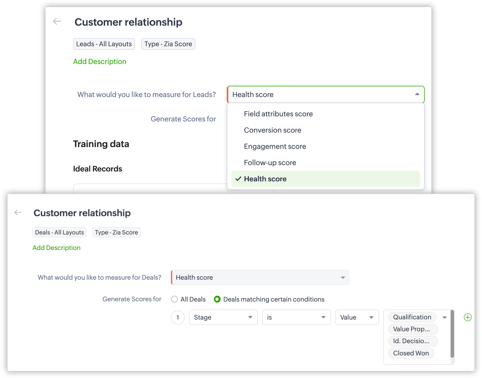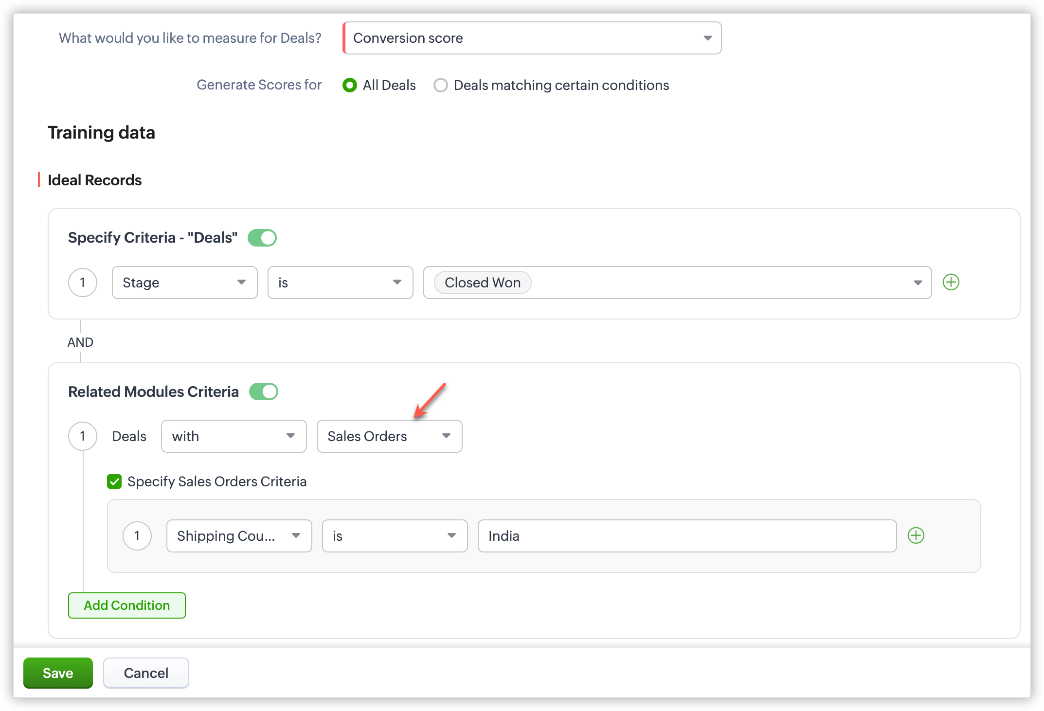 Exemplu: Dacă un utilizator creează Reguli de Punctare pentru modulul Tranzacții și setează criteriile ideale ca Etapa este Tranzacție câștigată și pentru modulul asociat criteriile ideale ca Tranzacții cu Comenzi de Vânzare. Zia ia în considerare toate datele din comanda de vânzare asociată tranzacției ca date de antrenare pentru înregistrările alese. Similar, ar putea lua în considerare toate datele înregistrării, precum apeluri, emailuri, întâlniri și așa mai departe.