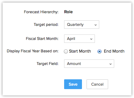 - În pagina Forecast Settings, modifică Target Period, Fiscal Start Month, Display Fiscal Year și Target Field conform cerințelor tale.