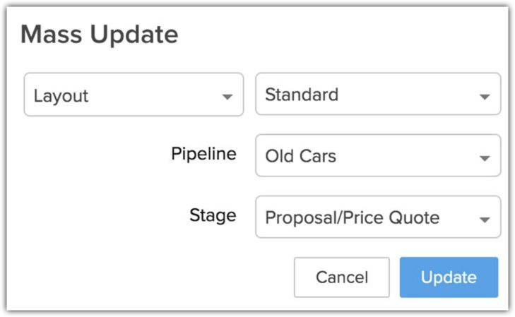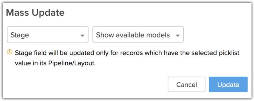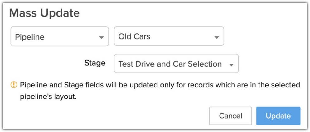 Când actualizezi înregistrările în masă, ține cont că un pipeline este specific layout-ului și că etapele din acesta sunt specifice unui anumit pipeline. În timpul actualizării în masă, înregistrările vor fi întotdeauna verificate pentru o potrivire în următoarea ordine: Layout > Pipeline > Etapă. (Poți actualiza în masă câmpurile de layout, pipeline și etapă din înregistrări).