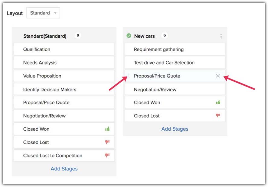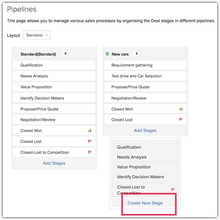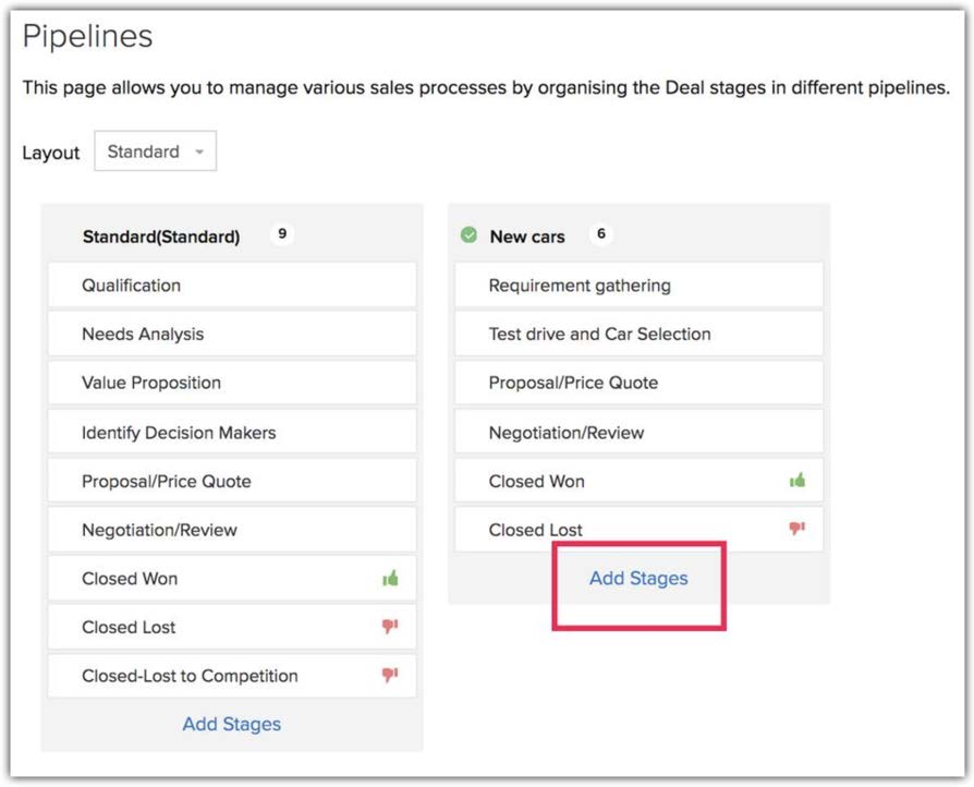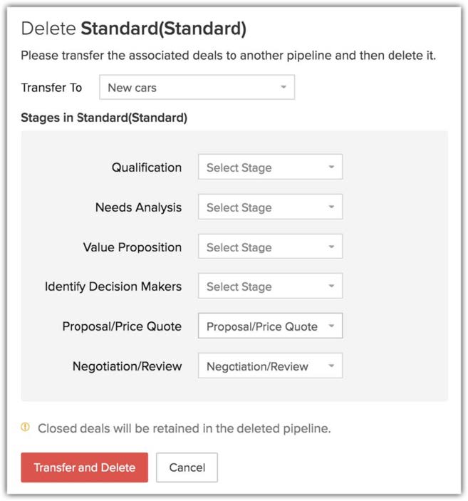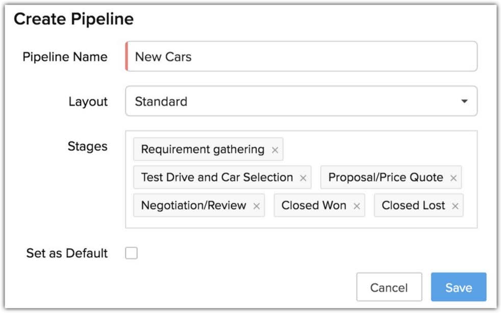 Deoarece fiecare proces este diferit, trecerea tuturor tranzacțiilor printr-un singur pipeline nu va oferi o înțelegere clară a progresului lor. Prin urmare, Zylker Cars trebuie să creeze mai multe pipeline-uri de vânzări pentru a arăta mai precis cum progresează o tranzacție.