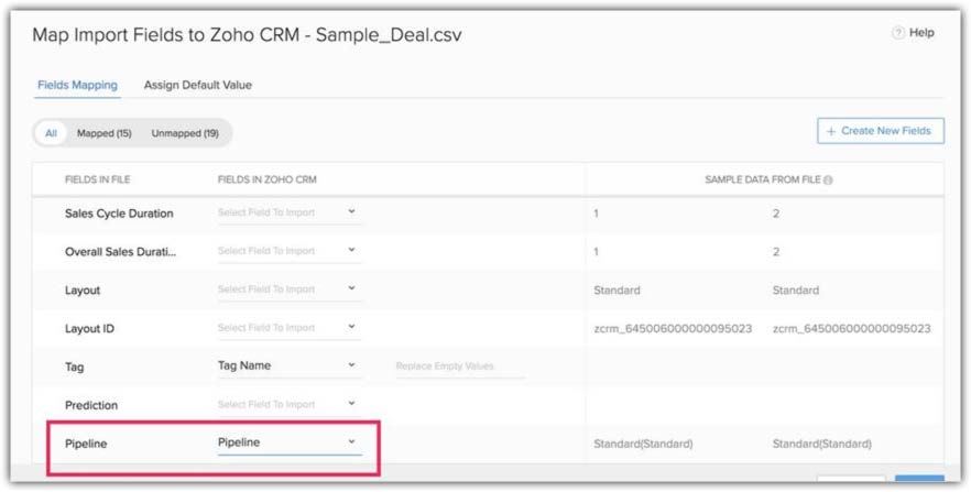 - Importul tranzacțiilor pentru același pipeline: Pipeline-ul este un câmp obligatoriu, deci dacă fișierul de import nu conține detaliile pipeline-ului, atunci toate tranzacțiile importate pot fi atribuite unui singur pipeline selectat. Poți selecta un pipeline în Atribuire Valoare Implicită.