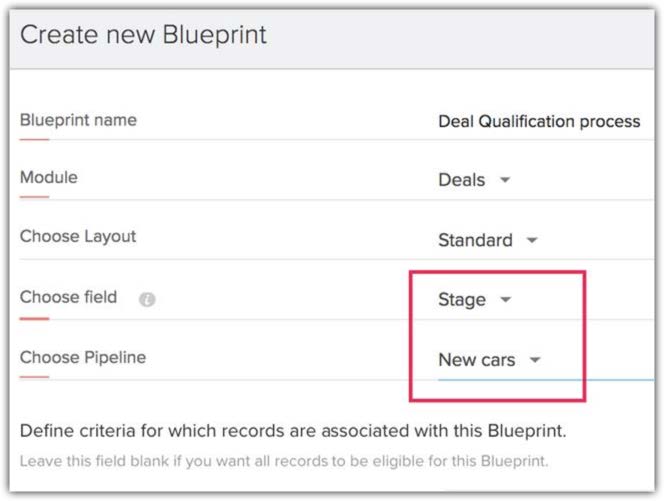 Câmpul Etapă este adesea utilizat în Blueprint-uri. În general, Blueprint-urile sunt specifice layout-ului, dar dacă ai creat pipeline-uri în layout, acestea sunt specifice pipeline-ului. Dacă creezi un Blueprint bazat pe câmpul Etapă, va trebui să selectezi pipeline-ul cu care este asociat. Toate valorile din câmpul Etapă vor fi utilizate în proiectarea blueprint-ului.