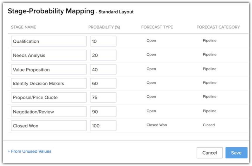 Este esențial să definești etapele din pipeline-ul de vânzări încă de la început pentru a avea un proces de vânzări solid, deoarece reprezentanții de vânzări din compania ta vor ști din timp ce se așteaptă de la ei pentru a duce leadul mai departe prin pipeline-ul de vânzări și a încheia în cele din urmă tranzacția. Acest lucru poate fi realizat prin personalizarea/adăugarea de valori în câmpul de etapă din modulul Deals din Zoho CRM. De exemplu, imaginează-ți că administrezi o publicație de reviste. Nu ai nevoie de unele dintre valorile implicite din câmpul de etapă, cum ar fi Propunerea de valoare sau Propunerea. Prin urmare, poți personaliza sau șterge aceste câmpuri pentru a corespunde cerințelor tale.