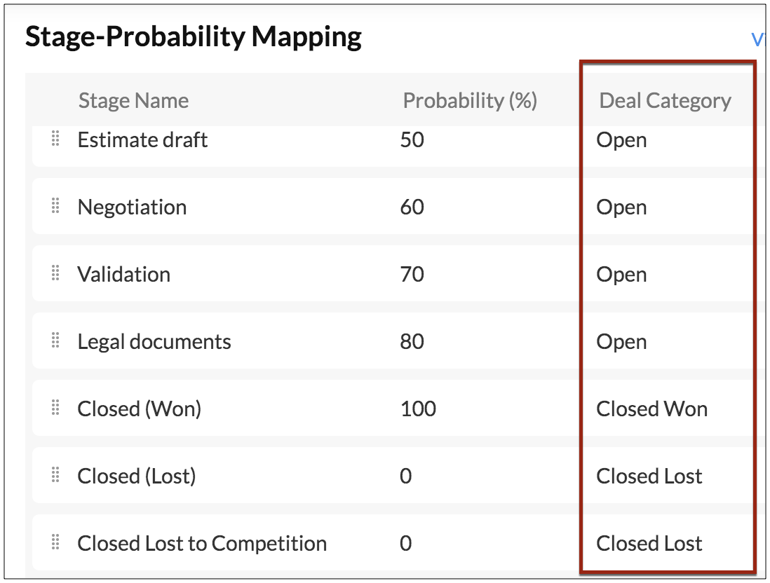 "OPEN deal" se referă la o tranzacție care este încă în desfășurare și nu a fost închisă. În acest context, opțiunea "OPEN" se referă la Deal Category din setările tale Stage Probability Mapping. Pentru fiecare etapă a tranzacției, poți atribui o categorie (Deal Category). De exemplu, în timp ce o tranzacție se află încă în etapele de negociere și documente legale, ea este încă "Open" (deschisă) pentru a fi urmărită, în timp ce odată ce este câștigată sau pierdută, a primit o rezolvare. Deci categoria tranzacției este marcată "Closed". Ai libertatea de a marca oricare etape dorești ca fiind Closed sau Open. Această setare este ceea ce se reflectă în Advanced Filters. Tot ce ai marcat ca "Open" aici va fi filtrat atunci când dai criteriul "Deal is OPEN". Și ulterior aceeași logică se aplică tranzacțiilor LOST și WON.