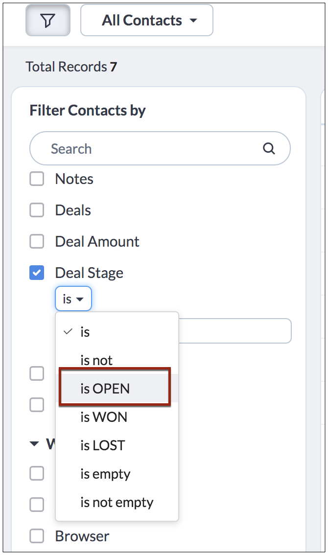 Când filtrezi contactele după etapa tranzacției folosind Advanced Filters, este posibil să observi opțiuni precum "Deal is OPEN", "Deal is LOST", "Deal is WON".