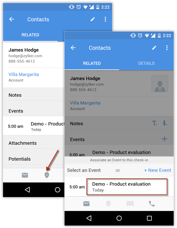 Când ai ajuns la biroul unui client, poți face check-in la locație folosind aplicația mobilă Zoho CRM. Când faci check-in, îl vei asocia unei întâlniri existente.