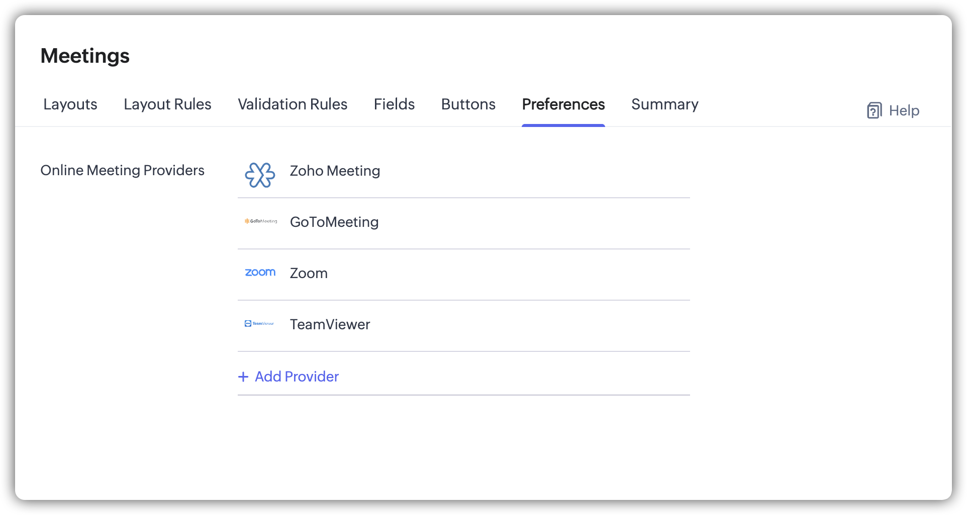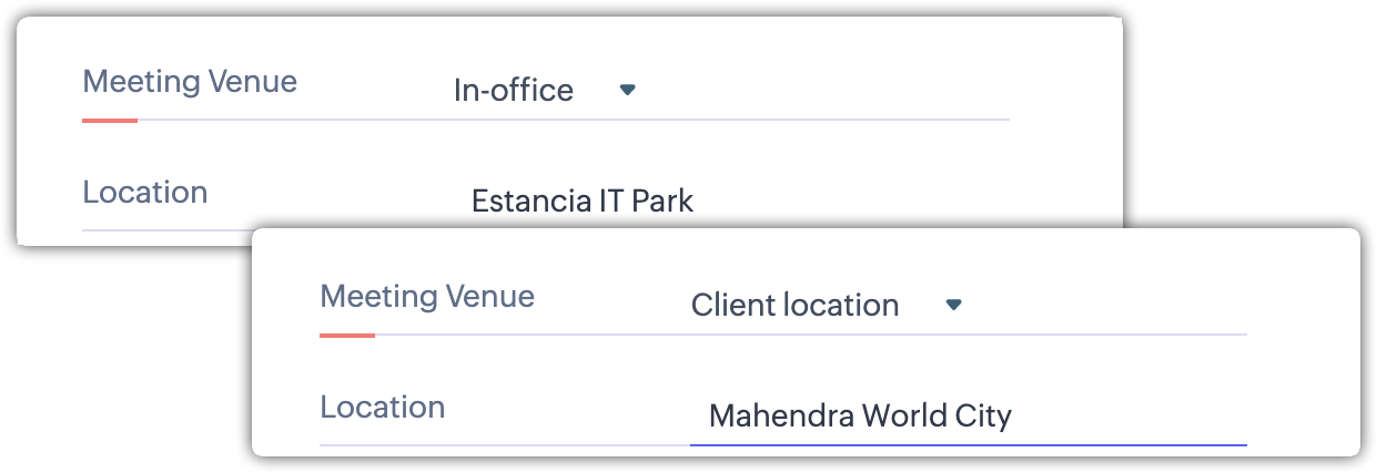 Întâlnirile sunt activități pentru interacțiunile dintre o afacere și clienții săi la un loc și o oră specifice. Întâlnirile pot fi organizate pentru a descrie caracteristicile, beneficiile, pentru a discuta despre servicii, sau pentru a negocia diverse oferte de afaceri și multe alte motive. În Zoho CRM am clasificat întâlnirile pe baza locului de desfășurare în trei categorii - Online, La birou și Locația clientului.