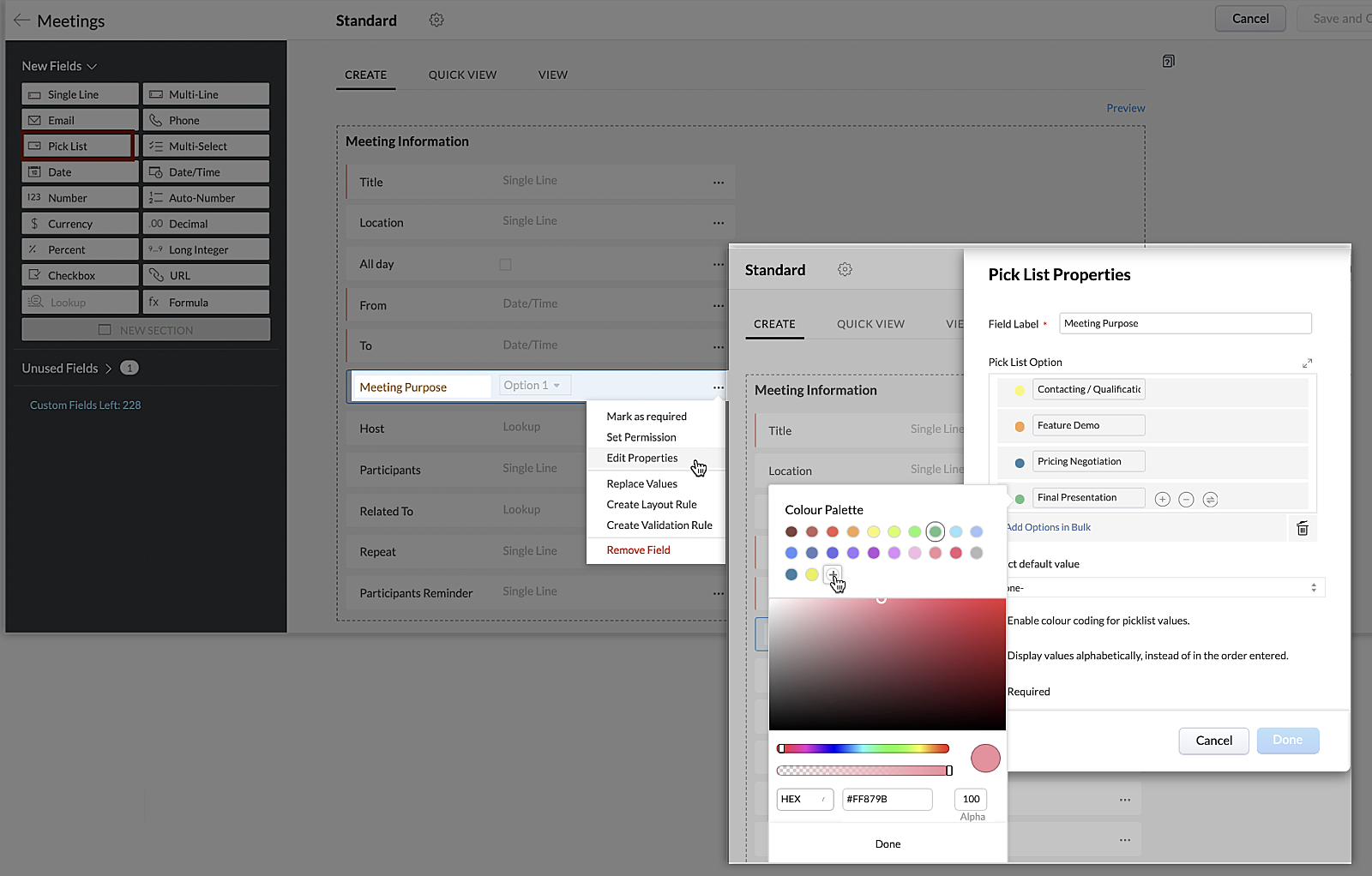 Mergi la Setup > Customization > Modules and Fields > Meetings