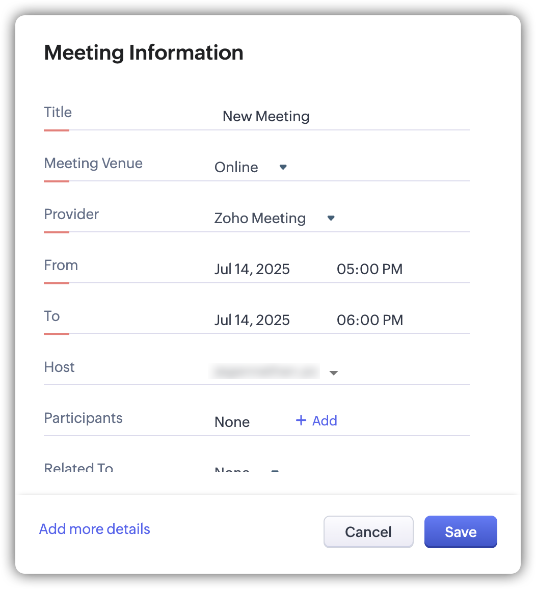 - În fereastra popup Meeting Information, specifică detaliile întâlnirii.