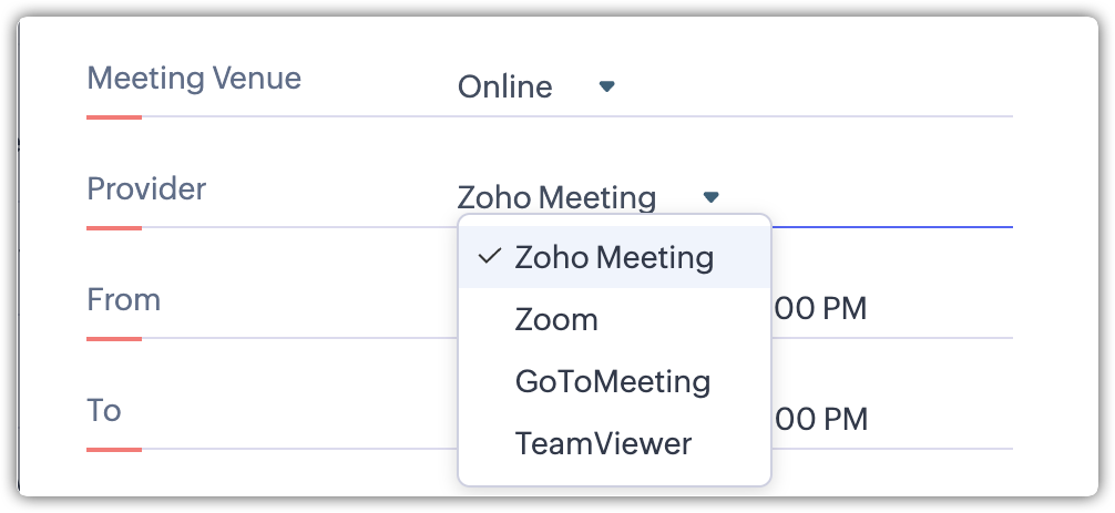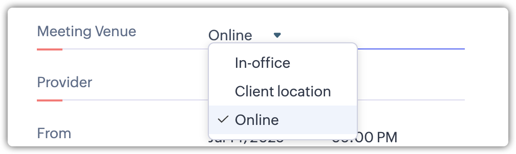 - Pentru Online: Alege furnizorul întâlnirii din lista de opțiuni din lista derulantă Provider.