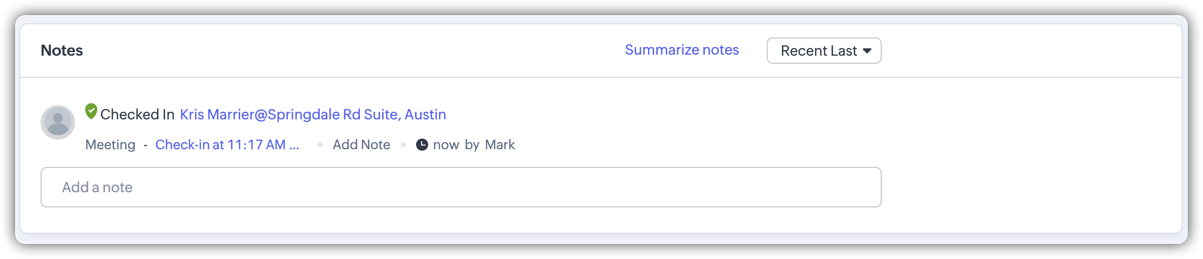 Odată ce un check-in a fost asociat unei întâlniri, detaliile check-in-ului pot fi văzute în pagina de detalii a întâlnirii cu care este asociat, precum și în pagina de detalii a lead-ului/contactului/contului asociat.