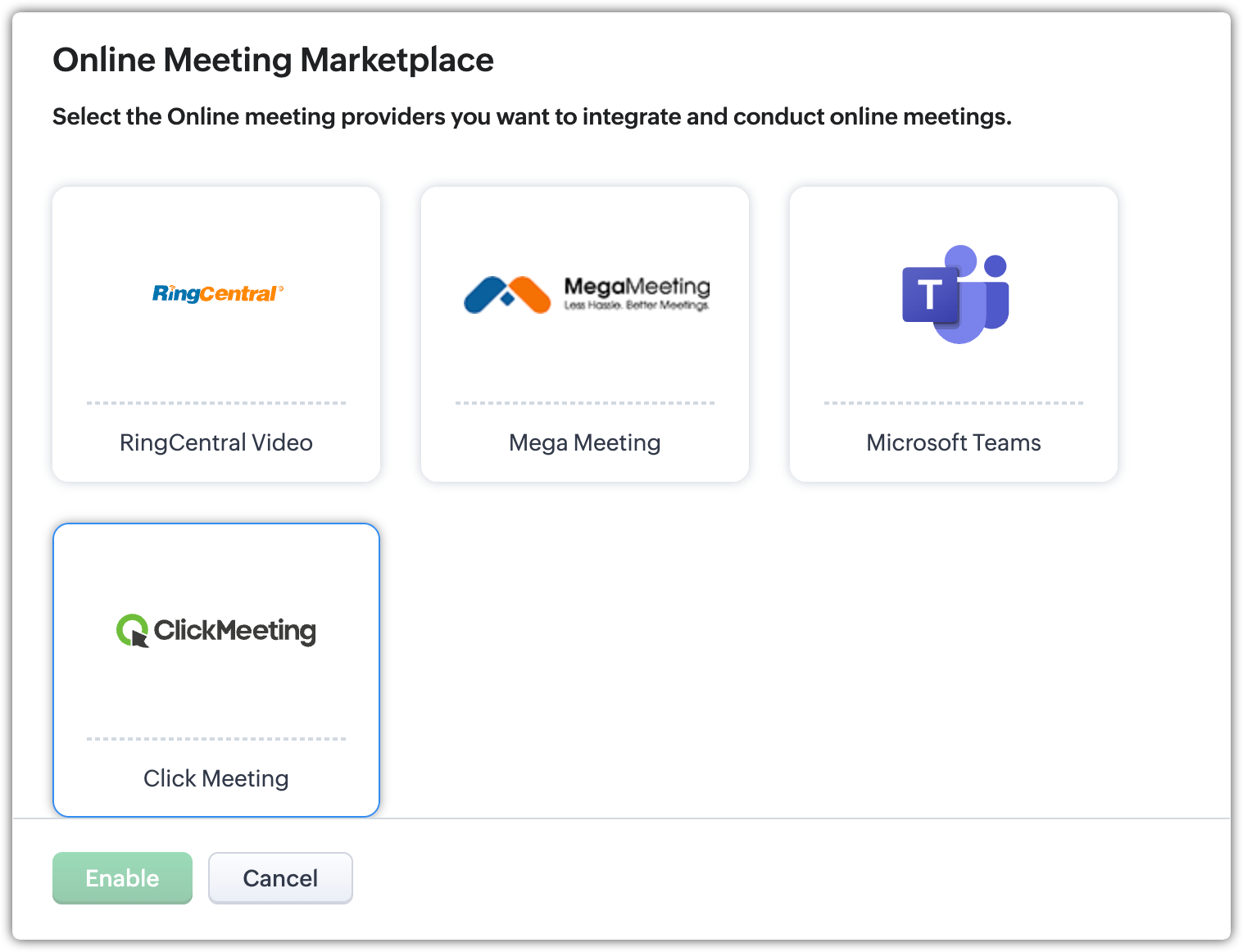 În fereastra pop-up Online Meeting Marketplace, selectează furnizorii de întâlniri pe care vrei să fie disponibili când se creează o întâlnire online.