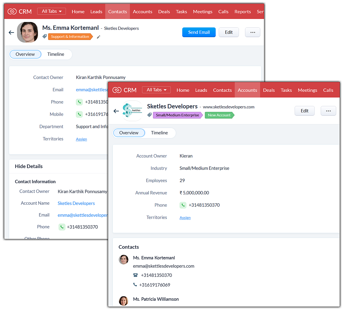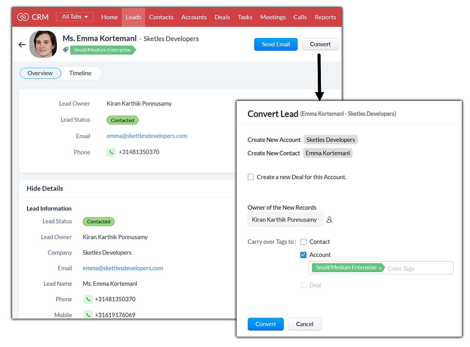 Este contactată pentru a afla mai multe despre ea și organizația ei. Odată ce reprezentantul de vânzări este satisfăcut, lead-ul este convertit într-un contact (Emma) și un cont (Sketles Developers).