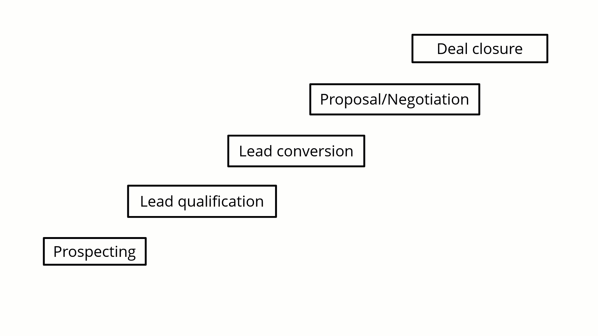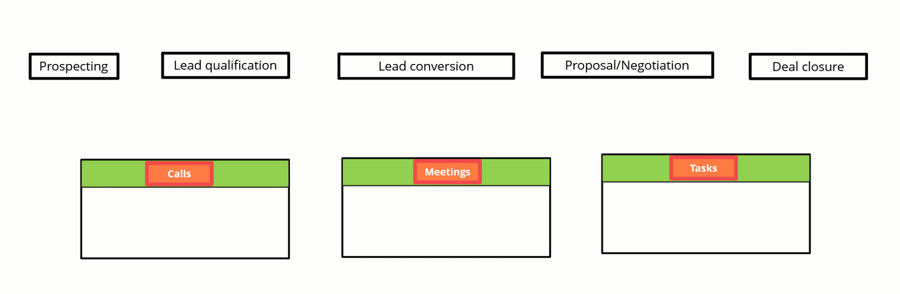 În orice moment, există lead-uri și tranzacții în diferite etape ale acestui ciclu. În fiecare etapă, o echipă de vânzări bună își adaptează activitățile și interacțiunile pentru a muta lead-ul sau tranzacția la etapa următoare.