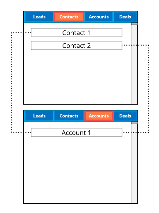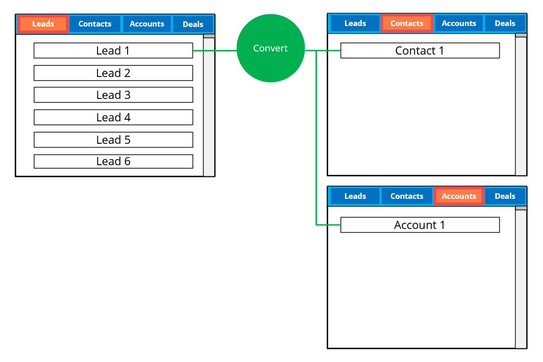 Înregistrarea lead-ului este împărțită într-o înregistrare de contact și o înregistrare de cont deoarece s-ar putea să ai de-a face cu mai multe contacte aparținând aceleiași organizații. Din acest motiv, este o idee bună să ai un modul Accounts cu doar detaliile legate de organizație. Poți asocia un astfel de cont cu mai multe contacte.