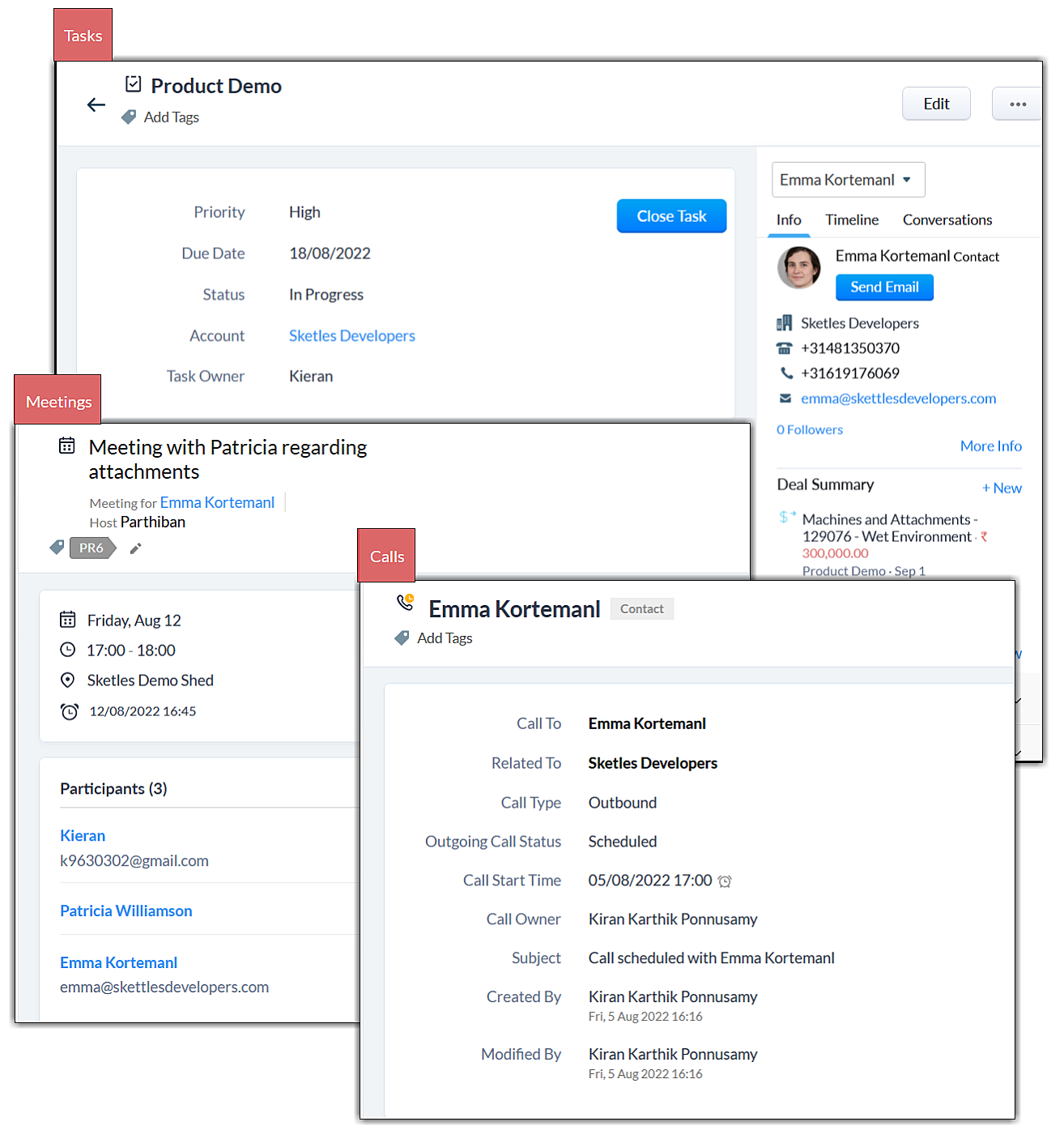 Poți adăuga și vizualiza aceste activități din cadrul înregistrărilor din modulele Leads, Contacts, Accounts și Deals. De exemplu, putem vedea toate activitățile asociate cu Emma în înregistrarea ei. De asemenea, putem crea sarcini, apeluri sau întâlniri din cadrul înregistrării Emmei.