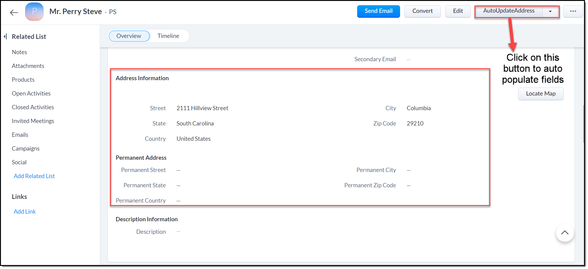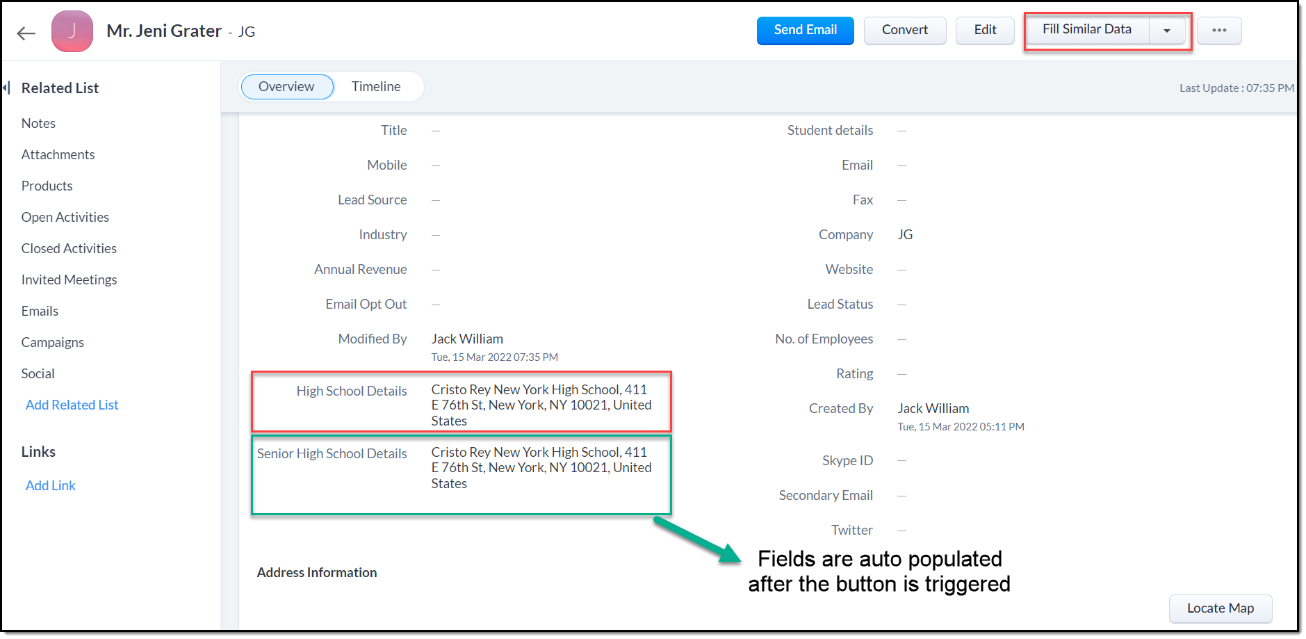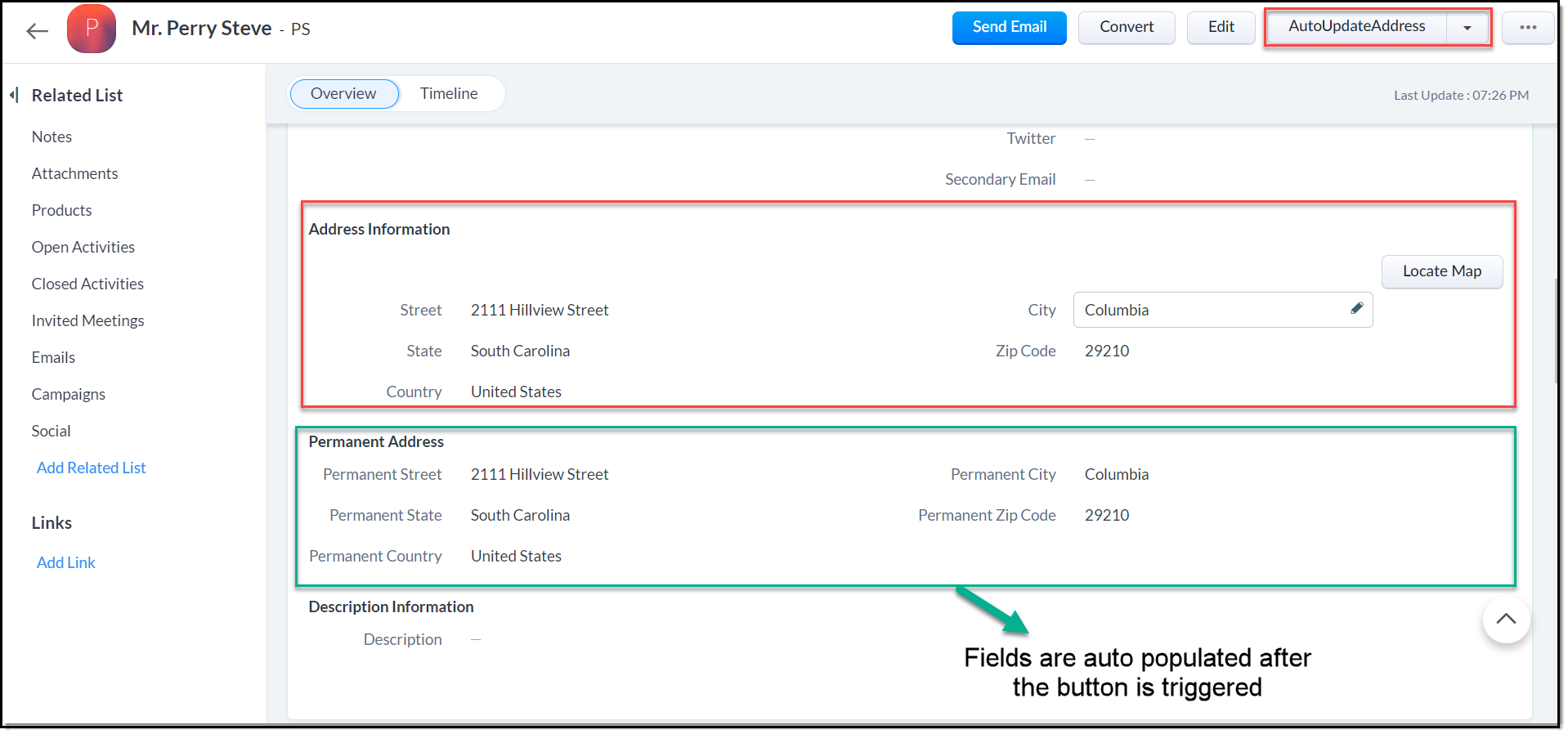 mp = Map();//Pentru exemplul 1mp.put("Mobile",phone);//Pentru exemplul 2mp.put("Secondary_Email",email);//Pentru exemplul 3mp.put("Permanent_City",city);mp.put("Permanent_Street",street);mp.put("Permanent_Country",country);mp.put("Permanent_State",state);map.put("Permanent_Zip_Code",zipcode);//Pentru exemplul 4mp.put("Senior_High_School_Details",highschool);//Comun pentru toate exempleleautoPopulate = zoho.crm.updateRecord("Leads",lead_id.toLong(),mp);info mp;info autoPopulate;return "Fields are populated successfully";