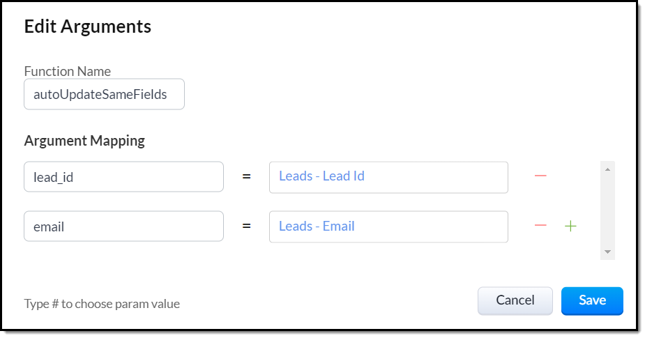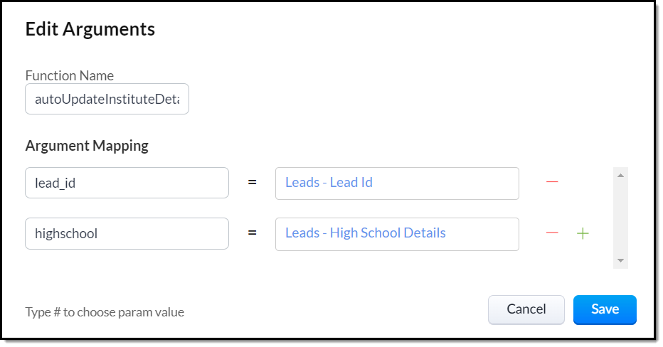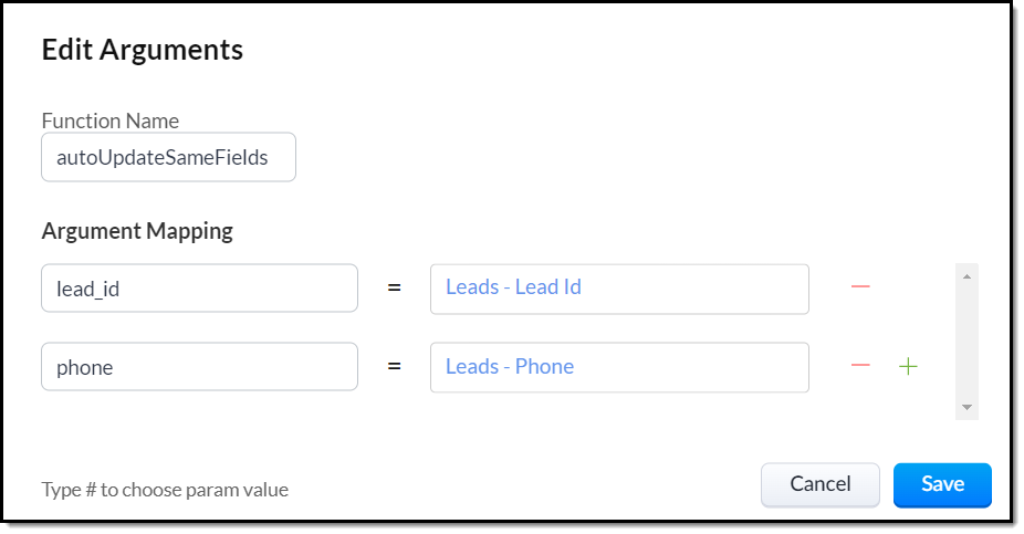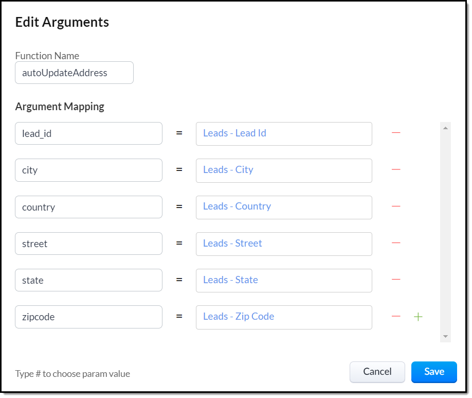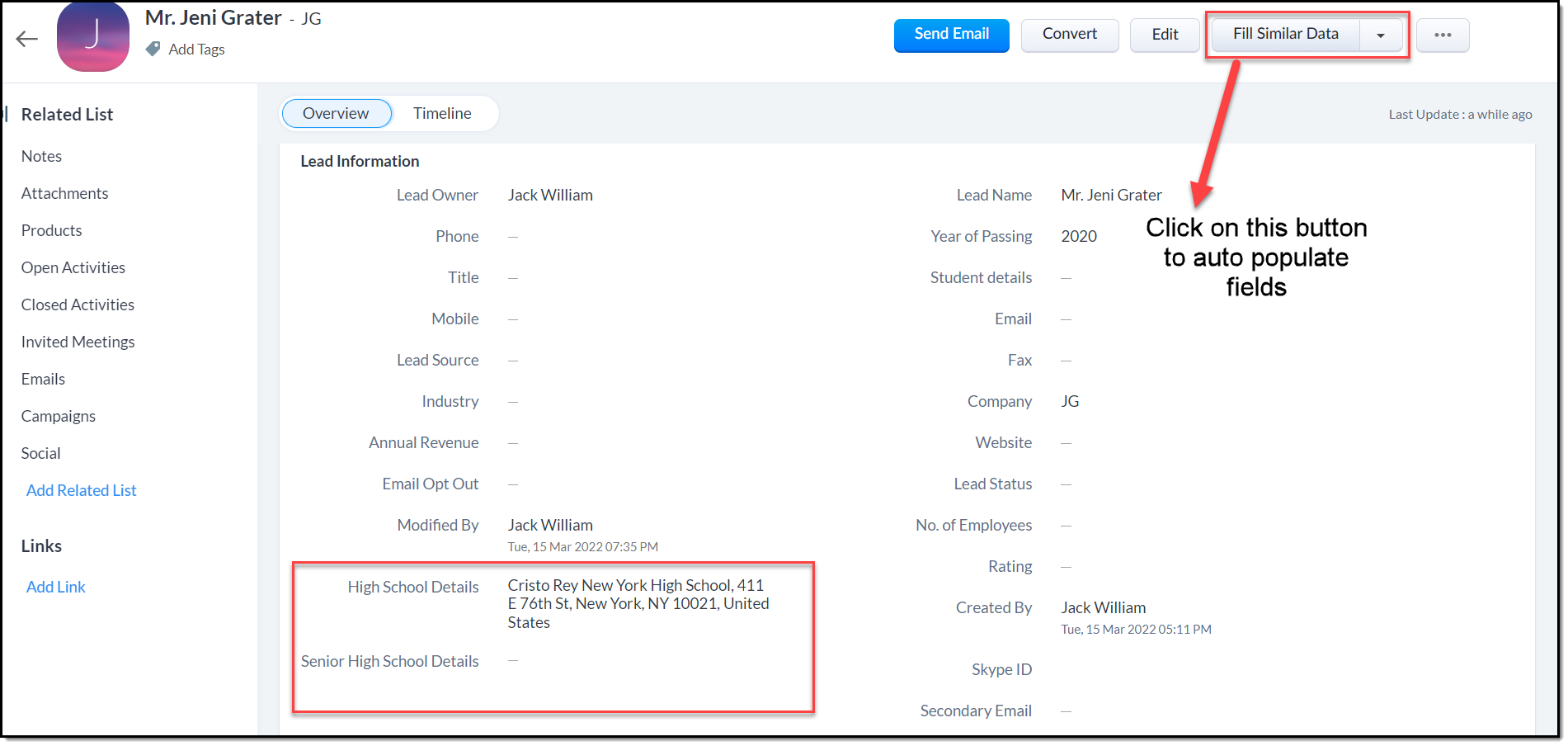 mp = Map();//Pentru exemplul 1mp.put("Mobile",phone);//Pentru exemplul 2mp.put("Secondary_Email",email);//Pentru exemplul 3mp.put("Permanent_City",city);mp.put("Permanent_Street",street);mp.put("Permanent_Country",country);mp.put("Permanent_State",state);map.put("Permanent_Zip_Code",zipcode);//Pentru exemplul 4mp.put("Senior_High_School_Details",highschool);//Comun pentru toate exempleleautoPopulate = zoho.crm.updateRecord("Leads",lead_id.toLong(),mp);info mp;info autoPopulate;return "Fields are populated successfully";