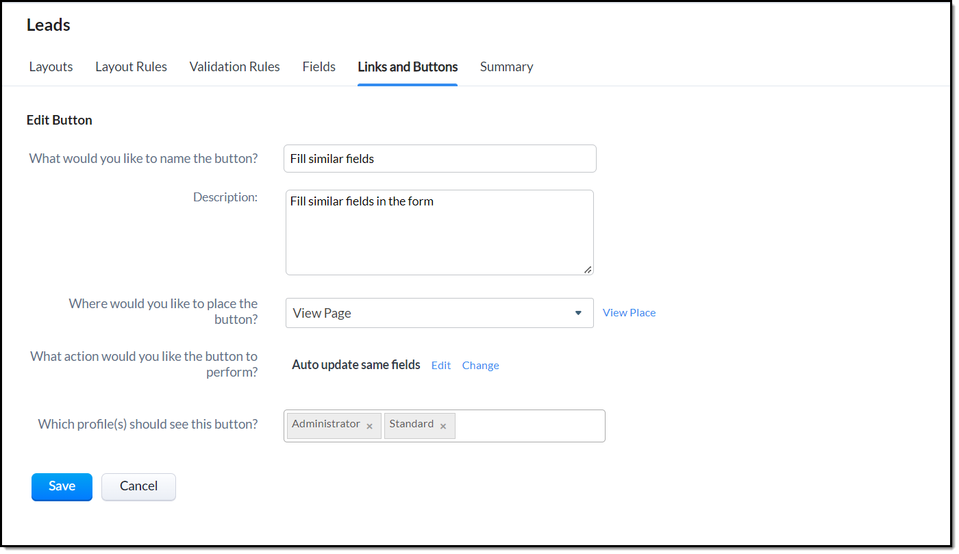 - Mergi la Setup > Customization > Modules and Fields > Selectează modulul dorit > Links and button > +New Button.
