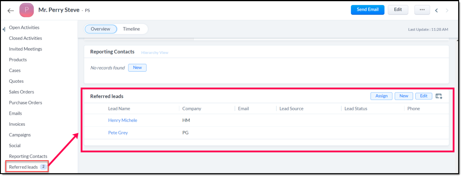 - Mergi la Contacts module > Selectează contactul care a recomandat un lead